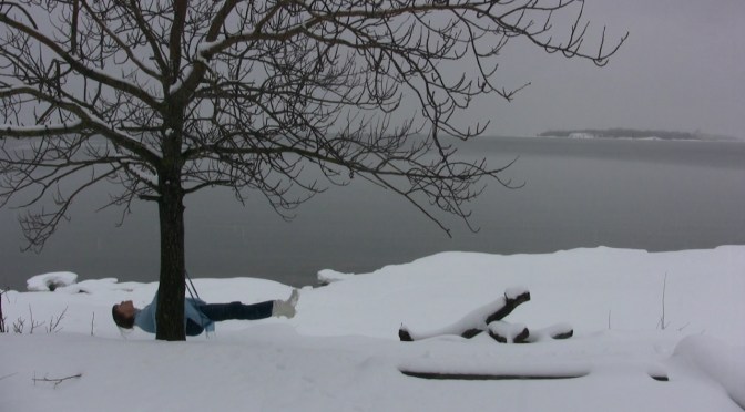 During the year of the snake, beginning with the Chinese New Year on February 10 in 2013, I fastened a small blue swing into an aspen that grows on the western shore of Harakka Island, next to the remains of the stone base of an old sauna. More or less once a week, I videoed myself swinging, wearing a light blue scarf, while keeping the position of the camera on a tripod and the framing of the image as constant as possible. On the same occasions I also sat next to the stub of another aspen that once grew nearby ¬– it used to be possible to fasten a hammock between them – looking out at sea with my back to the camera. And in another image I sat on a small pile of rocks looking at the expanding Helsinki harbour on the opposite shore. Thus I tried to produce “souvenirs” of what the landscape looked like during this year on the northern shore of the Finnish Bay.
