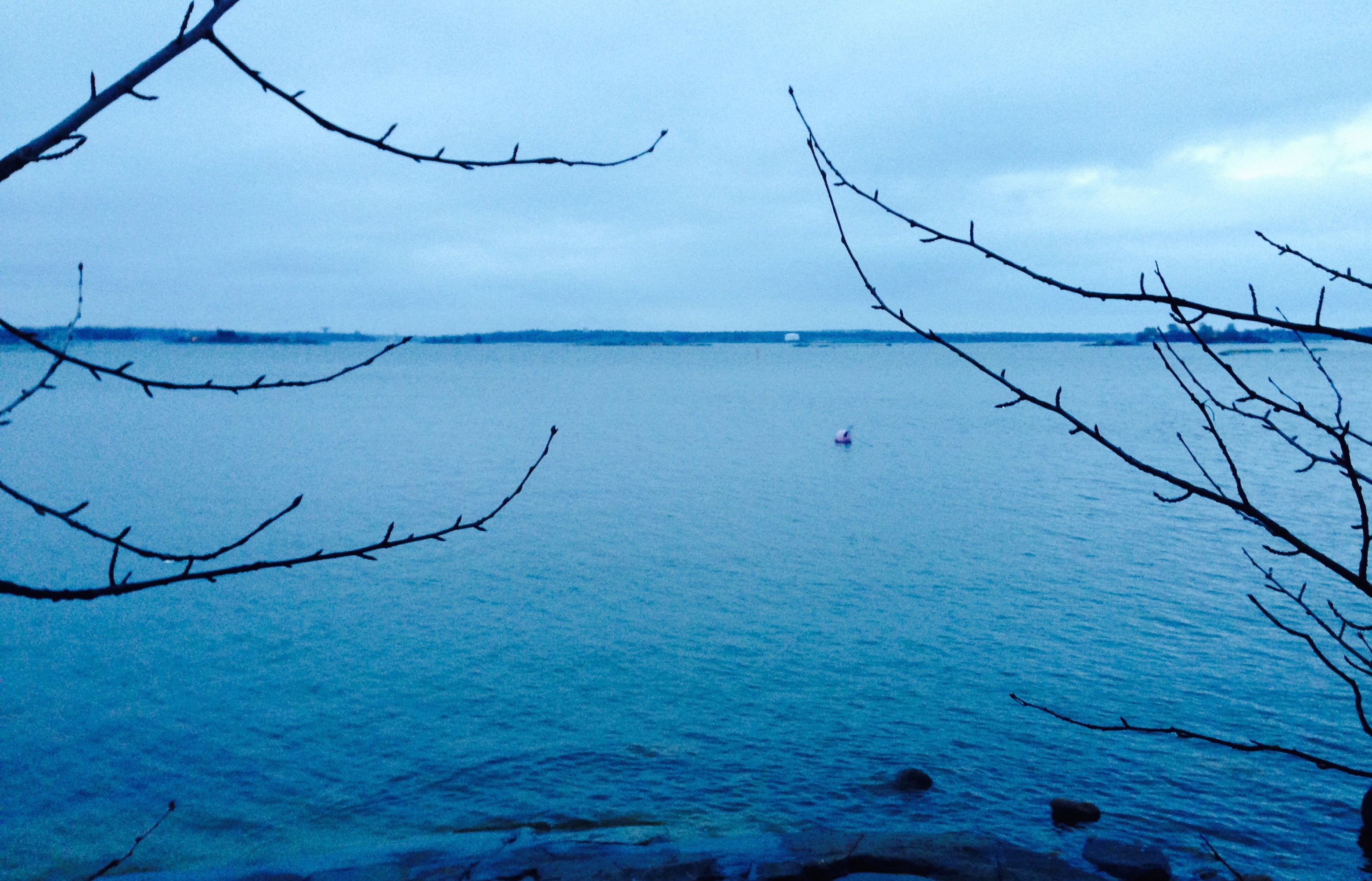 Aamuhämärässä kuvaaminen alkaa tuntua absurdilta kun sama harmaus jatkuu päivästä toiseen. Ei vähäisintäkään valoviirua taivaanrannassa, rusottavista aamuruskoista puhumattakaan. Aamu aamulta hämärä väistyy yhä aikaisemmin, tänään aurinko nousi Helsingissä virallisesti 4.49 (tai 4.46) mutta sen saattoi päätellä vain hitaasti valkenevasta päivästä. Eilen ihastelin puhelinkamerani tallentamia sinisen sävyjä, jotka kertoivat valon lisääntymisestä muutaman minuutin aikana, vaikkei silmä sitä huomannut. Tänään muutos oli päinvastainen: ennen auringon nousua kuvattu maisema näyttää harmaan siniseltä (katso yllä) ja heti sen jälkeen se onkin turkoosimpi (katso kuva alla). Ilmeisesti kyse on siitä, että pikkukameran valomittarin automatiikka toimii miten huvittaa, absurdia sekin.