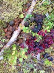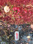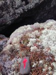 Esitysten lisäksi leikin pienellä nuolikivelläni ottamalla stillkuvia kännykän kameralla, kun taas varsinaiset esityskuvat on taltioitu videokameralla. Huomasin hämmästyksekseni, että maalipinta usein heijastaa valon niin, että nuolesta katoaa punaisen hehku. Ja silloinkin kun sain kiven sijoiteltua oikeaan kulmaan heijastuksiin nähden, nuoli jäi välillä toiseksi vaikkapa loistavan punaisen rahkasammaleen rinnalla. Kuvasin jäkälää ja kallioita, pahkoja ja puunkoloja, kaikkea pientä mikä ympäristössä osui silmään.