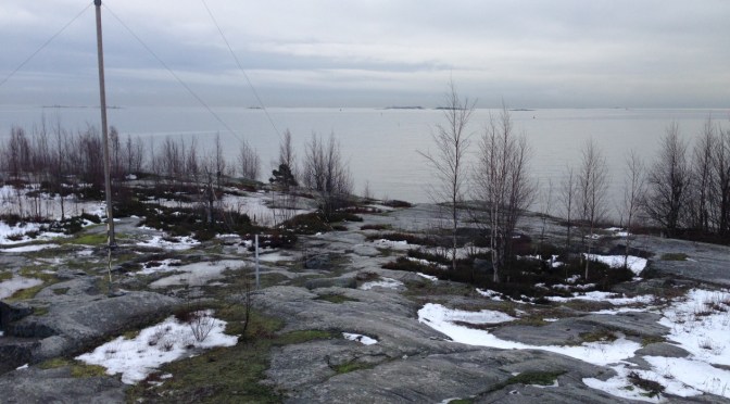 The sea was open when I came over to the island, but since there was no wind it felt like it could be freezing any moment. There was no thin layer of ice on its surface yet, but near the shores there was a sort of porous jelly that could turn into ice floes any minute. For a good ice to form it was not cold enough, though. I got a ride across to the island and went to perform, to stand and sit in front of the camera with my dark blue scarf on the hill towards west for the last time. This remake of my weekly performance during the year of the horse 2002, done once a month in 2014 ends here. The year of the goat will commence a month from now, at 19th of February. This remake is like an epilogue to “Animal years”, the twelve years I have documented on Harakka Island 2002-2014. There is a sense of endings in the air in other ways, too. I have bought a new camera and will start to use it for future projects, which means, among other things, that I will no longer be recording on tape. When I look at the small DV tape cover on my table, I can read the dates I have visited the hill and the rock below it: 6 February, 30 March, 12 April, 11 May, 2 June, 14 July, 12 August, 17 September, 11 October, 9 November and 14 December 2014. And now, today, on 19 January 2015.