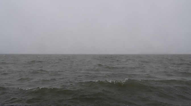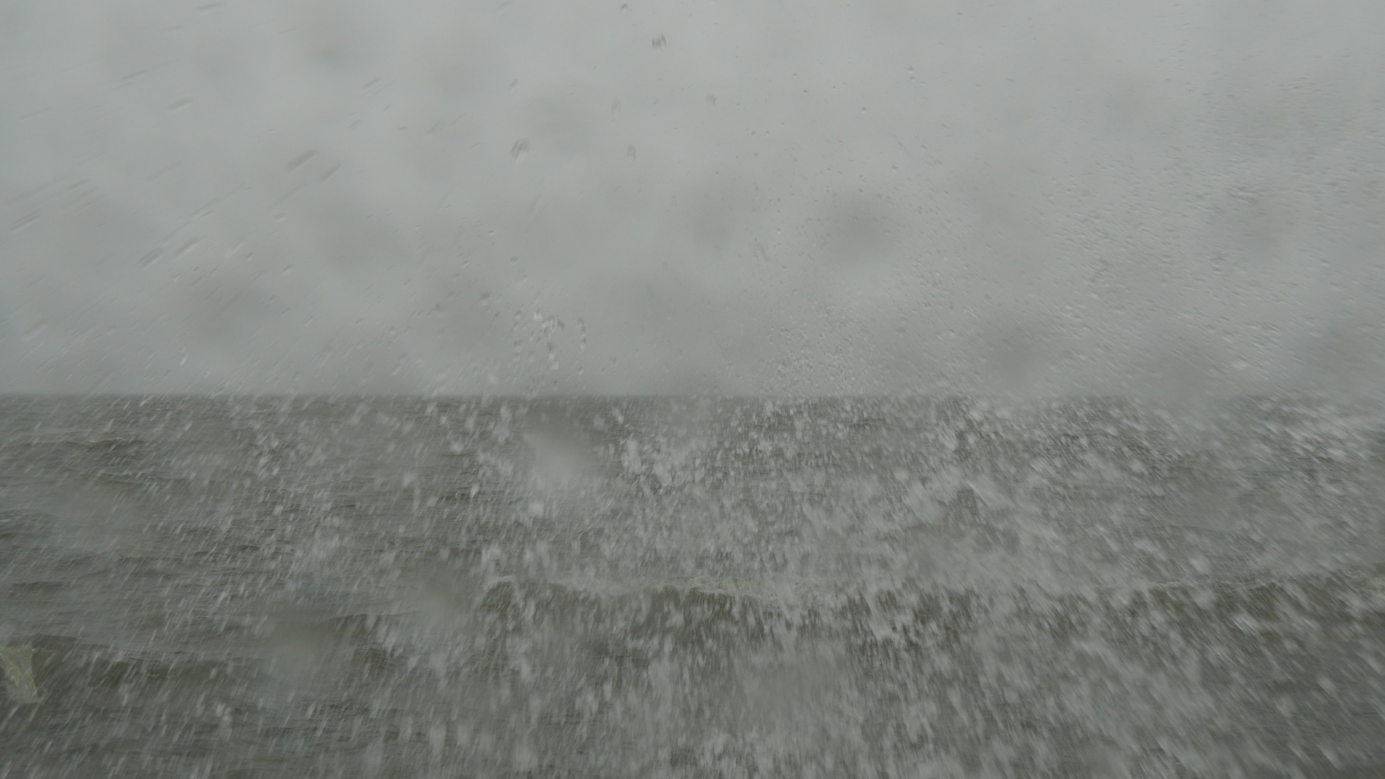 Sunnuntaiksi oli luvattu sadetta, mutta aamupäivällä sää oli poutainen, taivas utuisten pilvien peitossa. Kuulin että vuorovene kulkee jo, tunnin välein, ja yritin ehtiä yhden veneeseen, mutta myöhästyin. Olisin voinut soutaa, mutta lounaassa näkyi pilviä ja ajattelin, että voisin yhtä hyvin odottaa seuraava venettä etten joutuisi soutamaan takaisin sateessa. Hieno utuinen sumu horisontissa olisi ollut hieno alkukuva himmennettäväksi esiin valkoisesta, mutta sen ajan istuin kahvilassa odottamassa. Kun pääsin saareen sade oli juuri alkamassa, ja kiiruhdin kuvaamaan ennen kuin se yltyisi. Mantereelta käsin en tll ajatelleeksi länsituulen tuottamaa aallokkoa joka nyt paiskoi vettä rantakallioita vasten ja huuhtoi niiden yli niin vuolaasti etten voinut ajatellakaan asettavani jalistaa eiliselle paikalleen. Yritin asettua noin metrin lähemmäs rantaa, ja kastuin silti. Ja mikä pahempaa, myös kamera kastui. Paitsi sadepisarat myös aallokon tyrskyt piiskasivat kameran linssiä ja niin kuvasta tuli kaikkea muuta kuin sumuisen rauhallinen. Aallokko ja tyrskyt olisivat olleet hyvinkin dramaattinen aloitus omalla tavallaan, ellei ät pisarat olisi täyttänet kuvapintaa. Palasin sisään kuivattelemaan ja havaitsin ilokseni että kamera kyllä toipui vallan mainiosti.