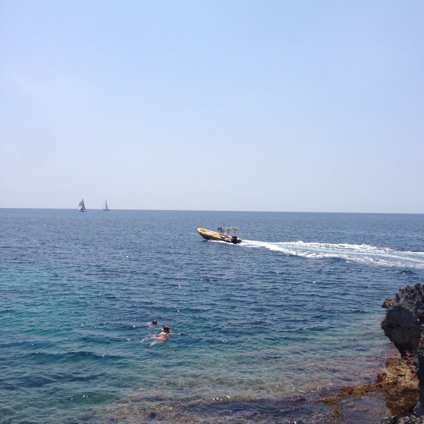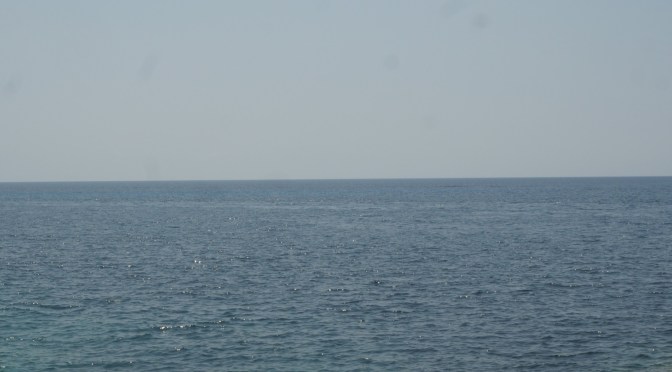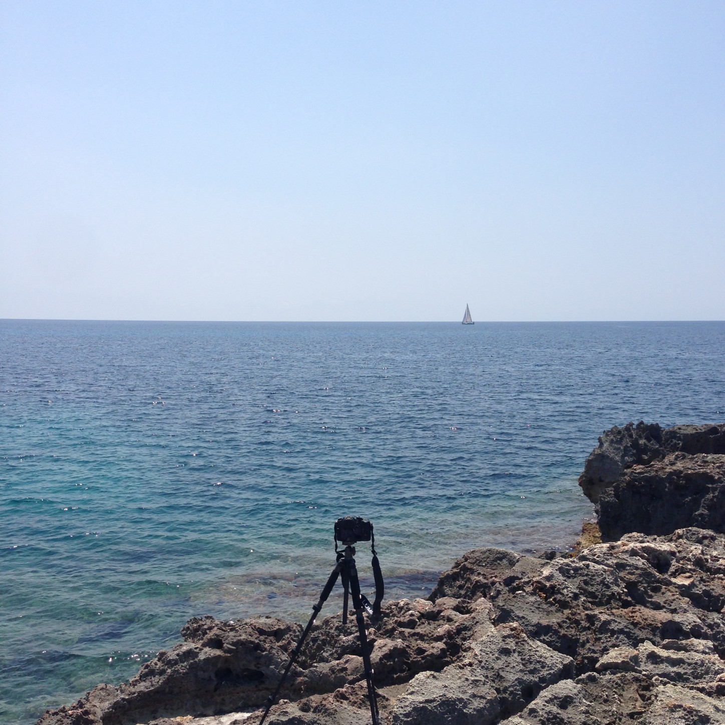 Arriving in Cala’n Bosch, a tourist resort on the west coast of Menorca, I immediately took a walk to the shore and looked at the open sea view thinking, this would be an easy piece. Just pick your spot, since there it was, everywhere, the open horizon. The blue Mediterranean Sea was spreading out in front of me undisturbed by islands, piers, boats or anything. So on Monday afternoon I took my camera and tripod and headed down to the shore, to the same rocky spot I first saw when arriving. I thought that would be a place where people would not be lying on the beach and I would not have to be embarrassed carrying a camera amongst them, as if wanting to document naked flesh or whatever. I walked out on the cliffs, which were surprisingly sharp and uncomfortable to step on, and found a place for my tripod. But to my horror, I saw a spot on the lens. I had my camera cleaned just a while ago, so this seemed like an ironic twist of fate. I did not return back to search for a vacuum cleaner, but resorted to my handkerchief in order to remedy what I could. And it helped a little bit, yes. But now, by the time I was all set up, a boat came by, so I waited for the waves to pass, and then another boat. And then a rubber boat parked right outside the cliffs, and I thought they might start diving or something, so I decided to move. But when I had packed my things and walked halfway up to the road, the boat started to move again, so I returned. Finally I managed to record almost three minutes of the view with an empty horizon, half of the image sea and the other half sky, à la Sugimoto, before two sailing boats showed up. Funny enough, even with plenty of empty horizon, recording it might prove to be a challenge.
