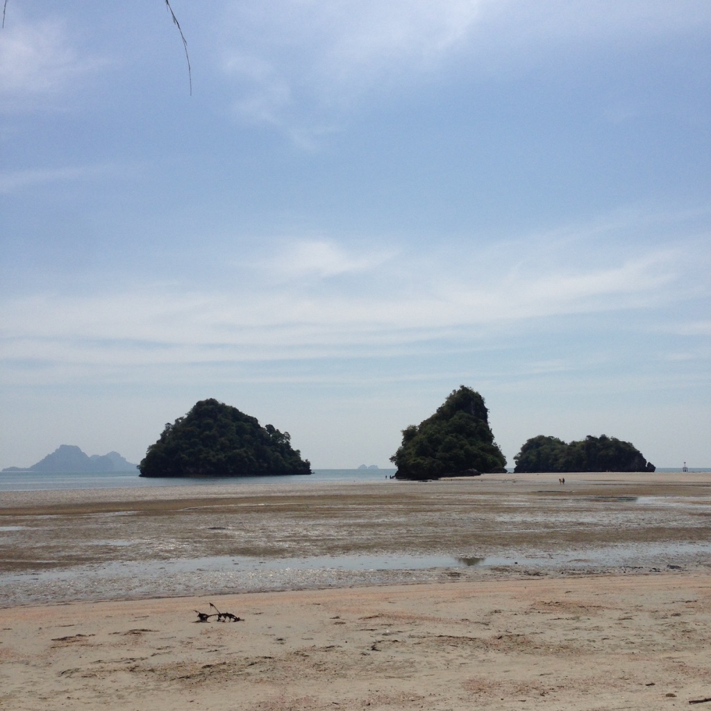 I was warned, and walked over along the ridge of sand, no short cuts through the mud. The rocks looked like strange houseplants rising directly from the sand. It was nice looking at the rocks at close distance, but there was nothing really interesting. On the way back, walking along the beach under the trees, trying to find some shade I stopped at a small pavilion and decided to document the view with all the hazy islands rising on the horizon, when a bulldozer suddenly appeared in my image, like some prehistoric monster.