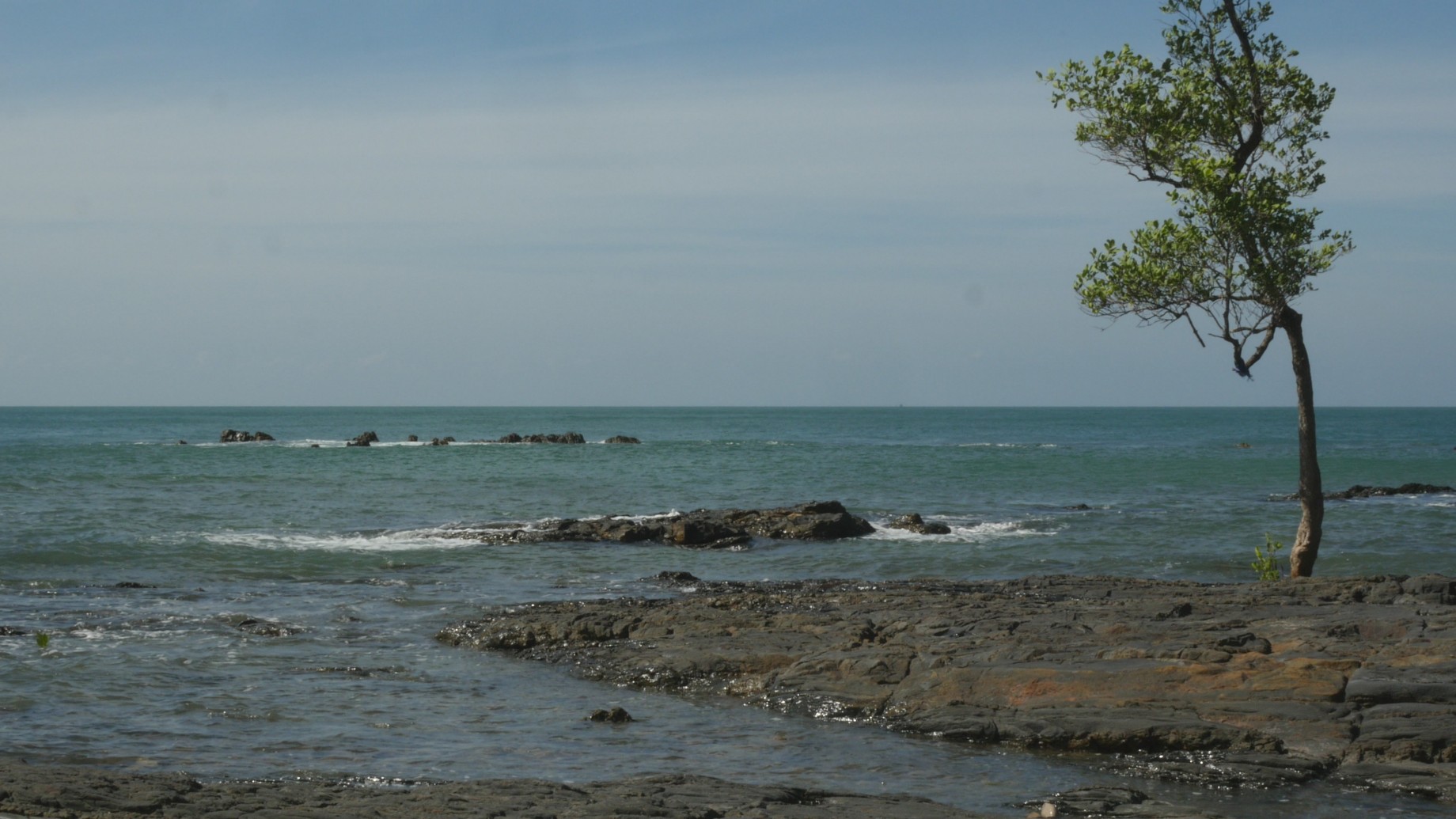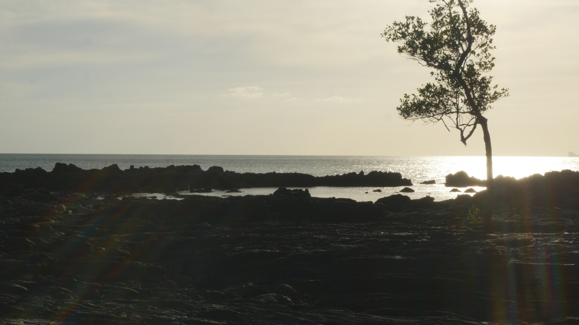 Arriving at Kan Tiang Beach in the peaceful southern part of Koh Lanta felt like a relief, partly because it was nice to be in a small tourist village instead of the hustle and bustle of Christmas in a tourist town like Ao Nang, partly because the feeling of being in the countryside was inspiring. Looking at the tide coming in and going out on the rocky beach yesterday made me decide that I would want to record the tide somehow. And today my travelling companion wanted to go to a small rocky cove nearby, because that would be a good place for snorkeling. The morning was windy and I had no desire trying to do some snorkeling in rough sea – I have bad experiences of that before – but the idea of a small rocky cove sounded ideal for recording the tide, so I was happy to follow on the entangled path through the jungle. It was not far, but we lost the path and had to press ourselves through some heavy bushes, uh, and I was afraid I would never find my way out from there again. The cove was pretty and secluded, though. And I soon discovered the path from the beach, so I was not afraid of staying there on my own. It was only a few hours before high tide, and a small tree was standing in the middle of the cove, growing right from the rock, or so it seemed. It would be standing in water by high tide, I assumed. So I framed my image to include the tree, and used the horizon to divide the image into two halves, as I am accustomed to lately. Then I walked into the image and stood by the tree, and intuitively leaned against it, using it for support and comfort.