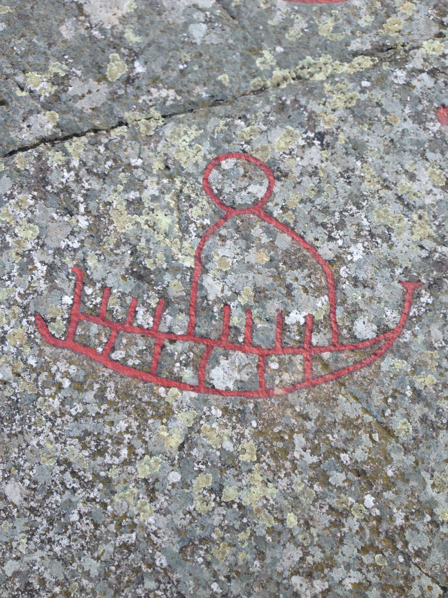 Sieltä kävelin järven rantaa takaisin Sandvigiin, ja löysin aamupäivällä huomaamani reitin, joka johti viivasuorana jonkinlaista ylänköä pitkin takaisin kotiinpäin, mutta puolimatkassa odotti vielä viimeinen turistiyllätys, ‘helleristningar’! Ja nämä olivat paljon suuremman kallion pinnassa. Lisäksi joku avulias arkeologi oli päättänyt avustaa turisteja tunnistamisessa maalaamalla kaiverrukset punaisiksi – mainio ajatus.