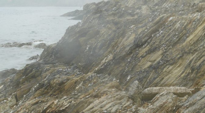 After participating in the inspiring seminar organized by Rock/Body: Performative Interfaces Between the Geologic and the Body I asked some of the participants with knowledge of the area around Penryn where I could possible find ‘live rock’ or ‘wild rock’ nearby, and they suggested the beach in Falmouth, adding that I would not find granite but sandstone, which was fine for me. I thought I could walk down to Falmouth in the evening after the seminar, but the weather was getting worse and the discussions were interesting, so I decided to try in the morning instead. And yes, I easily woke up at six with the light, left my room at seven with a biscuit and some water, my camera and my pale pink poncho and headed towards to shore to see if I could find some rock to pose with. It took me an hour to get to Falmouth, and half an hour more to find the beach and some rocks by the beach. On the way to the beach I noticed there were two trains going up to Penryn, one at 9.30 and the other after 11, which was a little late considering that I should be catching the train to Truro and London at 12.47. But I thought I could take the risk if I found something to really work with. I followed some paths that led me nowhere near rocks so despite the high tide I decided to simply walk on the shore to the end of the beach, where I placed my tripod at the end of the concrete path and sat down on the first ‘wild rock’ on the shore. No time for too many tryouts. And the rock sure was wild enough, very different from the cliffs smoothened by the glacial ice at home.