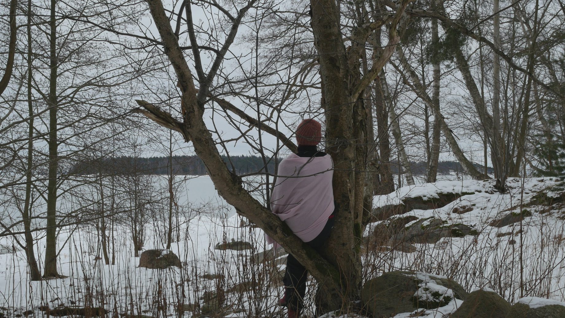 Rowans are not so easy to find in Helsinki, it seemed, but when I googled images of rowans and then looked where they had been taken, I found some places. One of them was Haahkatie in Lauttasaari, that is, Ådvägen på Drumsö, near my old school as a child. I also remembered the small rowan I fastened my swing on more than a year ago in Särkiniemi Park in the vicinity, when I performed at the opening of the LARU Human Era environmental art exhibition. Thus I decided to make an excursion and see if I could find a suitable rowan for my calendar performance in Lauttasaari. The rowans near Haahkakuja looked pretty but the surroundings were not so interesting with all the big buildings so I walked along the shore all the way to Särkiniemi peninsula. Most of the trees along the shore were alders, willows and birches. There were some rowans, too, but most of them small and slender and entwined with other trees. Only after taking a tea break in the nearest pub, and deciding to try to do something with some of the not so suitable rowans I had passed, did I actually notice an older rowan near the shore with a low branch to climb on to. For some reason I wanted to stand next to the tree rather than sit on it.