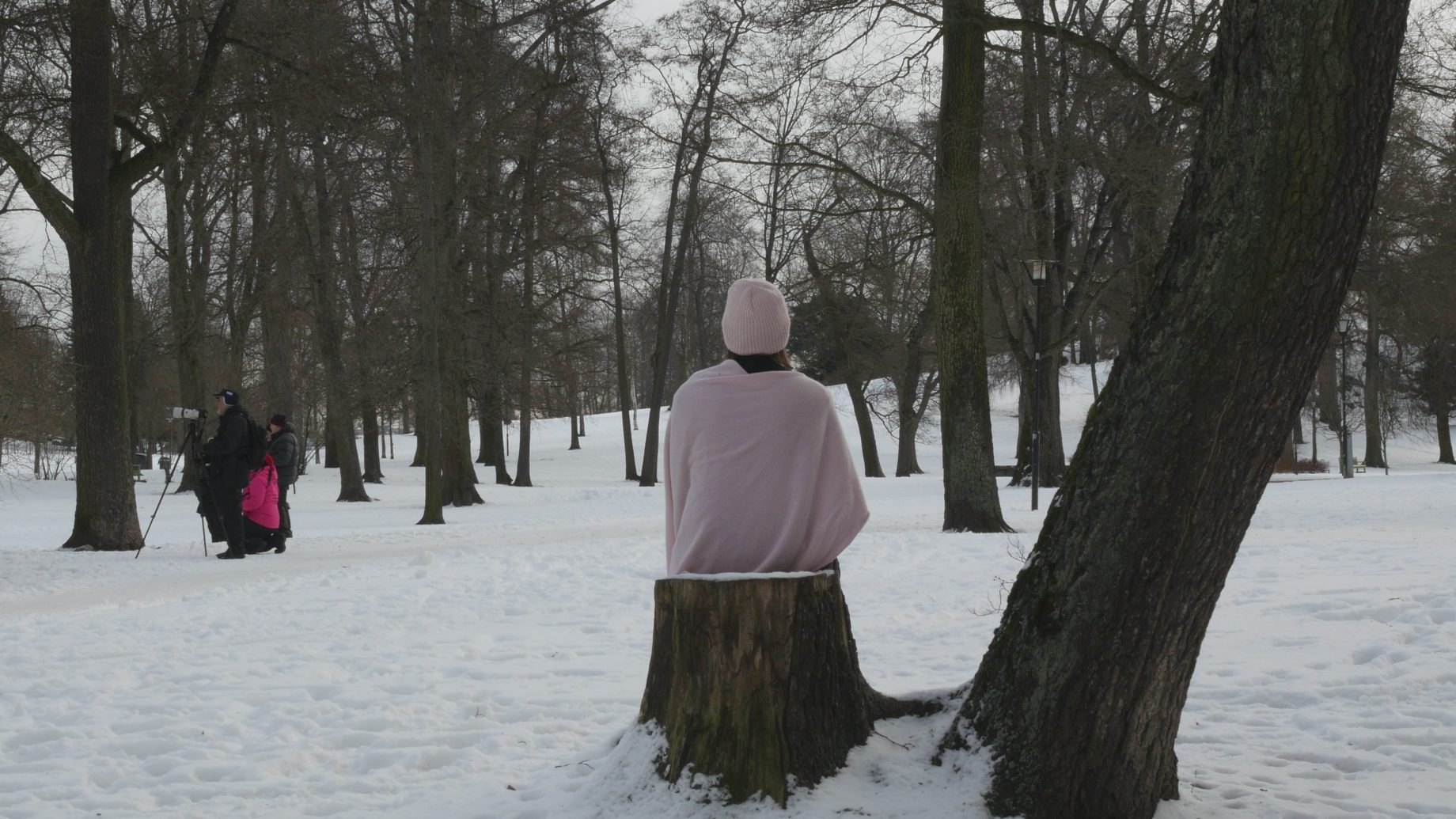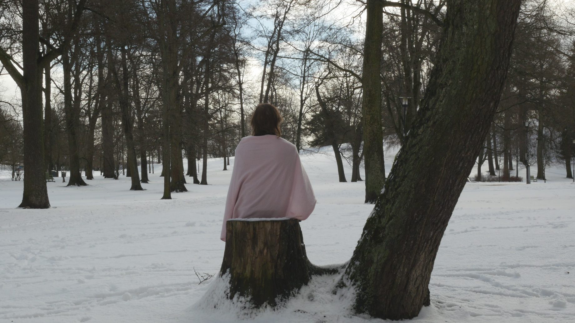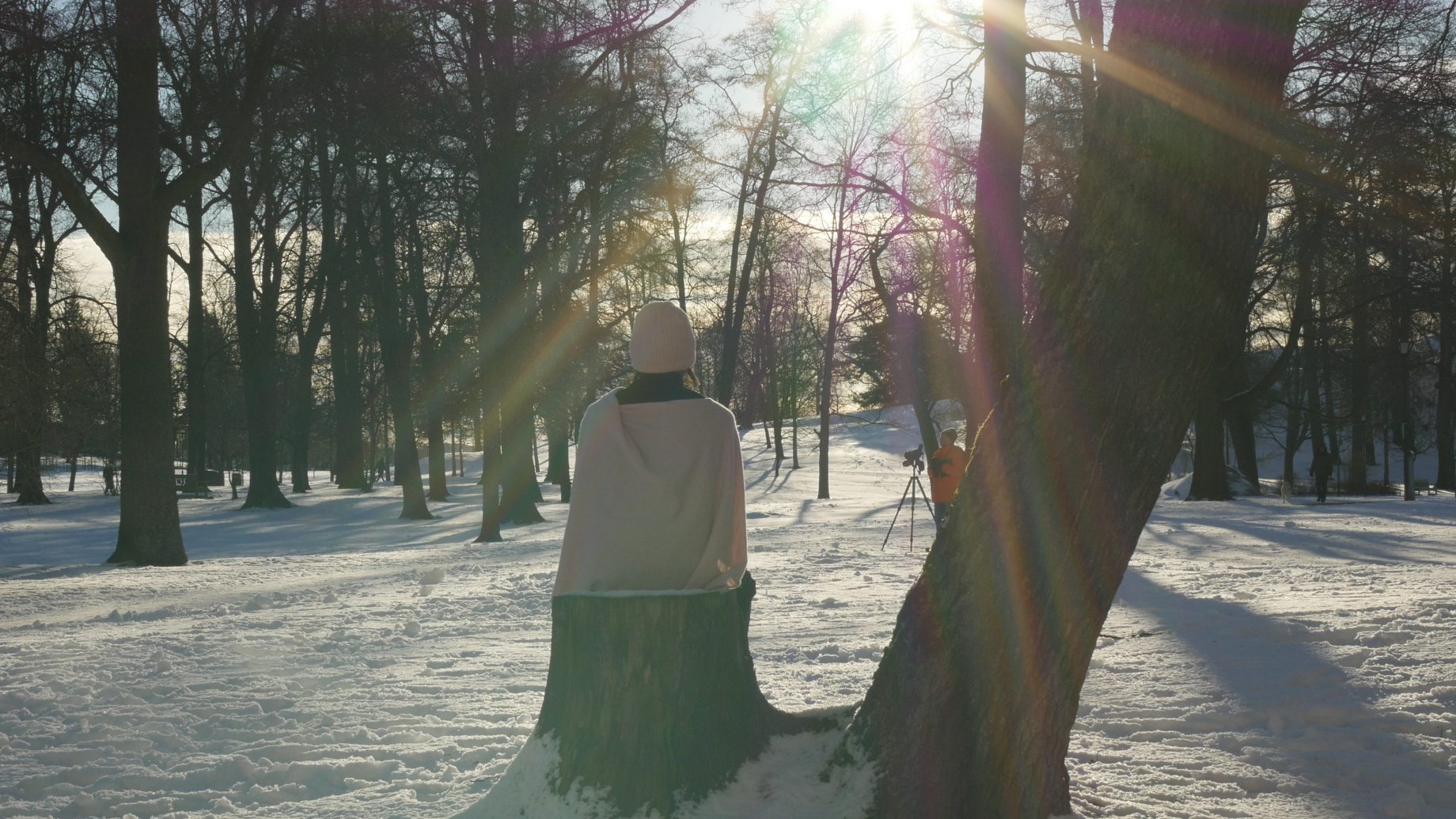 On Friday morning it was still chilly, minus 6 degrees celsius, but sunny and clear. I realised a structural problem with my images: the morning sun shines beautifully from the east, as a side light, revealing the forms of the tree trunks when I am sitting on the hill, but it shines me directly in the eyes, and thus blinds the camera, too, when I sit on the alder stub down in the park. And that does not look very nice, as you can see…