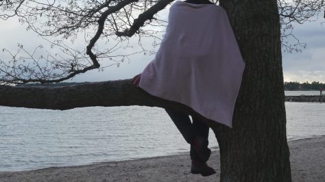 The alder is the tree of the fourth month in the old lunar Celtic Tree Calendar, and the actual dates for the month of the alder are from March 18 to April 14, although there are variations. Alders are easy to reconise even in winter time because of their small cones, and they grow in abundance on the shores of Helsinki, many of them old and twisted, very beautiful. Finding one with a suitable branch to sit on, sufficiently sturdy and low for easy access, is another matter. A colleague sent me a photo of a nice looking tree in Mellsteninranta, Haukilahti, to the west of Helsinki, and already two weeks ago I made a trip to the area to find it. At that time I did not have my camera with me, and planned to return later. This “later” was about to be too late for the month of the alder, I realised, unless I performed before my Easter holiday trip. So, without further a do, I decided to make an attempt on Tuesday afternoon between two trips. Since I had visited the tree before, I knew I would need something to step on in order to get up easily; the branch was a little bit too high to sit on directly, and there was no other branch placed in such a way that I could heave myself up. After considering some alternatives, like a bucket upside down, I found a small stool in the attic and packed it in a bag with my camera, the tripod and the pale pink scarf. Before I could take the bus out to Mellsteninranta it was already evening, with dark clouds covering parts of the sky, but I decided it was worth a try. And it was, alhough the last image was already rather murky.
