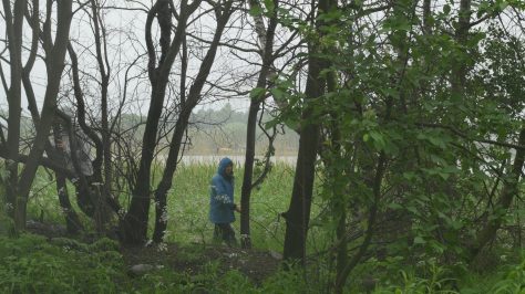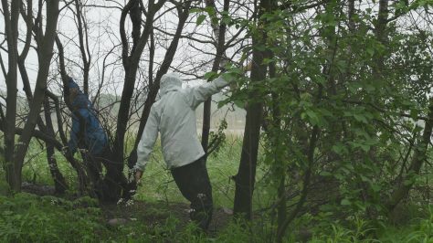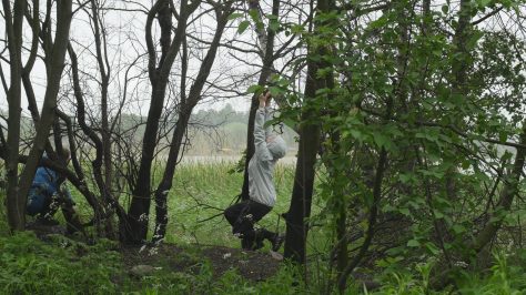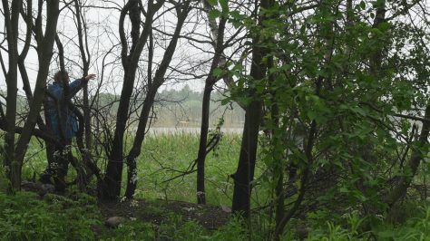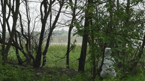 Puoli vuotta ehti vierähtää ennen kuin pääsimme uudestaan pöheikköön liikkumaan, Kirsi Heimonen ja minä, ja vielä samalle paikalle, oudolle palaneelle alueelle Töölönlahden rannassa, jossa vierailimme pakkasessa tammikuussa, ja josta on säilynyt myös blogimerkintä Kulon jäljet Töölönlahden rannassa. Paikka oli helppo löytää, vaikka se näytti todella erilaiselta kesän vehreyden peitossa ja vielä sadesäällä, mutta suhteellisen saman kuvakulman löytäminen ei ollutkaan yhtä helppoa, koska maaston kasvillisuus houkutti etsiytymään sivummalle, mutta lopulta löytyi suurin piirtein sama näkymä. Horisontti tosin oli viimeksi ylempänä, nyt asetin sen vaistomaisesti kuvan puoliväliin. Mustaksi palaneet rungot olivat entisellään ja näytti siltä kuin joku olisi sytyttänyt tulen puiden väliin, mikä vaikutti kyllä älyttömältä. Osa puista oli kuolleita, vaikkei niiden runko ollut kuin hiukan noessa, mutta voihan olla että niiden juuret olivat vaurioituneet palossa. Näkymä ei tietenkään ollut yhtä dramaattinen kuin mitä mustat hiiltyneet rungot olivat olleet lumihankea vasten. Mutta mustuneet puut tuntuivat nyt entistä enemmän kuolleilta kun kaikki ympärillä rehotti elinvoimaisen vihreänä. Liikuimme samoilla paikoilla, minä istuin matalalle oksalle jossa istuin talvella ja kiipesin jopa koivuun koska muistin sitä edellisellä kerralla yrittäneeni. Muuten liikuin nyt enemmän ja rohkeammin, ehkä lämpimämpi ilma ja kevyempi vaatetus helpottivat liikkumista, tai sitten tihkusade haastoi liikkeelle, olemaan piittaamatta siitä. Ympärillä oli vilskettä. Pullojen kerääjien joukko oli kokoontunut rannalle lähistölle, ja jossakin vaiheessa kävi mielessä, että olimme ehkä valloittaneet heidän vakiopaikkansa. Polkupyörälähetti kävi rannassa kääntymässä, kuin joku olisi tilannut ruokaa leiripaikalle. Sateen kiihtyessä poistuimme vähin äänin paikalta, kumpikin taholleen ja totesimme lyhyesti, että jatketaan. Poimin videolta muutaman stillkuvan, joista saa ehkä jonkinlaisen käsityksen:
