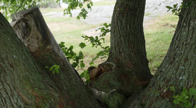 Now that the grass around the elm tree is cut the stubs of the two trunks that accompany the three growing ones are more visible. One of them is completely hollow, and was perhaps cut down because it was rotting from the inside, while the other is cut rather high and looks like it was a quite healthy when cut off. Anyway, they all grow from the same root, so when I say I am sitting in the elm tree I am actually not describing the situation clearly. I am sitting under the elm trees or at the foot of the elm trees or, well? – Most of the time these (holi)days I am actually sitting in the former telegraph on Harakka Island, as a gallery guard of sorts.