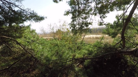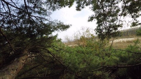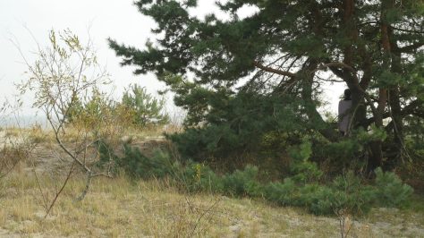 On Tuesday afternoon I climbed up to the dunes and looked for a suitable pine that would stand relatively alone, so I could have an image of it from a distance without other branches hindering the view. And of course I wanted to find one I could easily climb on and not be completely covered by the needles. I chose one near the open dunes and tried to find the right angle for the camera with regard to the sun. I had also brought with me my go pro, and wanted to experiment with recording the view from where I sat in the tree with that camera while my main camera on the tripod would record the whole scene. I made four attempts with the tripod placed at various distances. The two first ones are in close up, resembling the work called Year of the Dog – Sitting in a Tree (2007), where I was sitting in a pine on Harakka Island once a week for a year (2006-2007) with only my shoulder visible in the image. The first one is actually too dark, almost in backlight, but there you can see something of the landscape below. The third one is about as far as I could get without bumping into another tree and shows the pine in full. The fourth image is something of a compromise, from a distance, but closer, so you can see the human figure more clearly. It is perhaps closer to a romantic version again. Resting with a Pine 9-12 are all online, too.