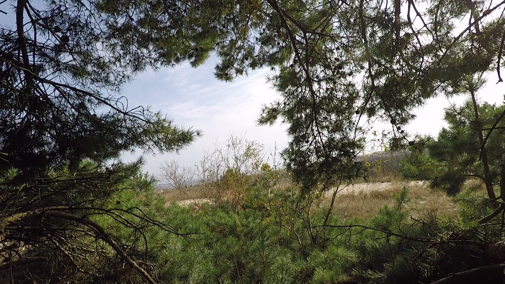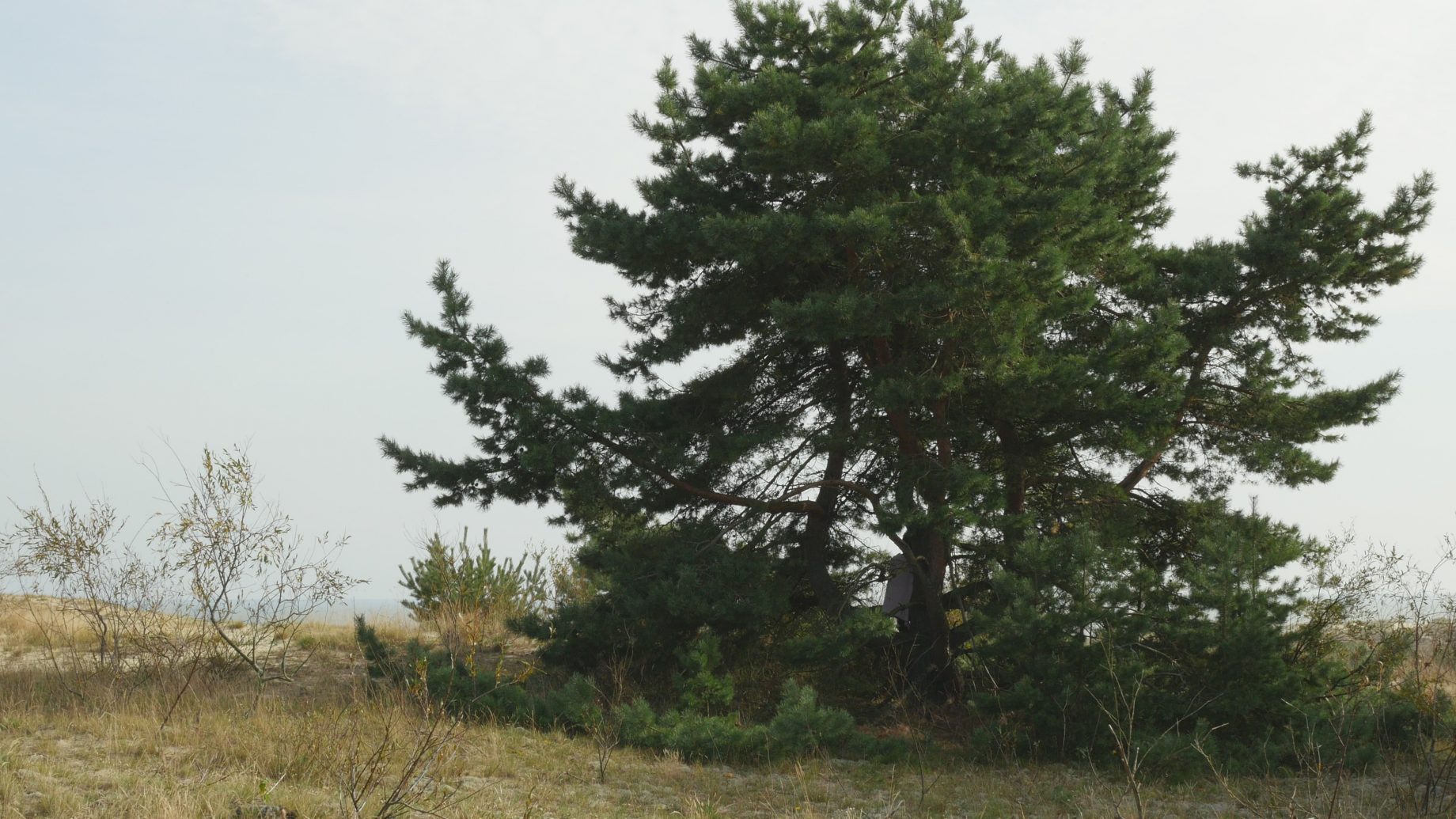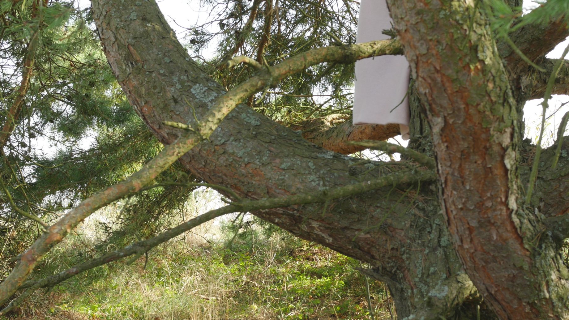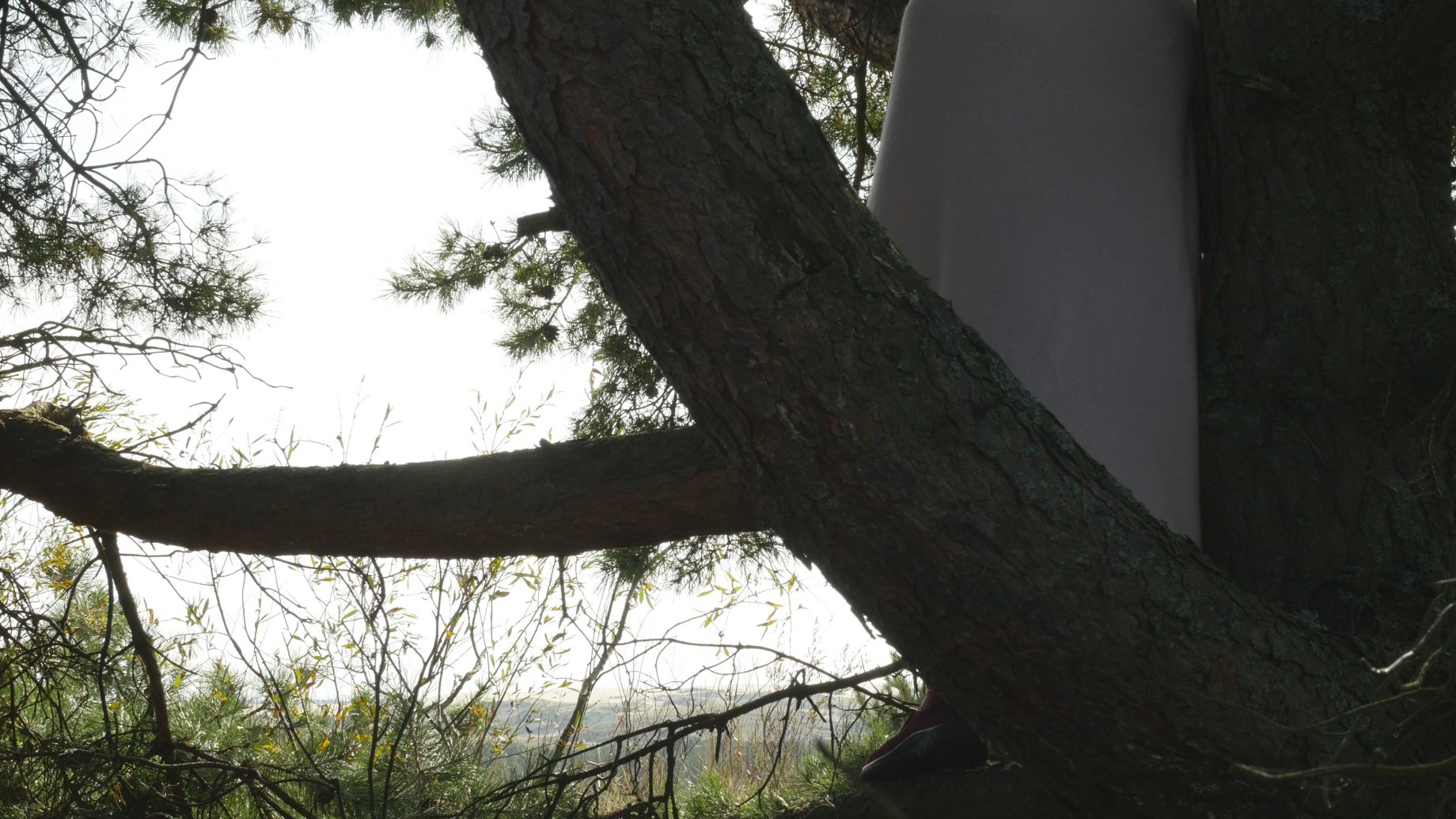 On Tuesday afternoon I climbed up to the dunes and looked for a suitable pine that would stand relatively alone, so I could have an image of it from a distance without other branches hindering the view. And of course I wanted to find one I could easily climb on and not be completely covered by the needles. I chose one near the open dunes and tried to find the right angle for the camera with regard to the sun. I had also brought with me my go pro, and wanted to experiment with recording the view from where I sat in the tree with that camera while my main camera on the tripod would record the whole scene. I made four attempts with the tripod placed at various distances. The two first ones are in close up, resembling the work called Year of the Dog – Sitting in a Tree (2007), where I was sitting in a pine on Harakka Island once a week for a year (2006-2007) with only my shoulder visible in the image. The first one is actually too dark, almost in backlight, but there you can see something of the landscape below. The third one is about as far as I could get without bumping into another tree and shows the pine in full. The fourth image is something of a compromise, from a distance, but closer, so you can see the human figure more clearly. It is perhaps closer to a romantic version again. Resting with a Pine 9-12 are all online, too.