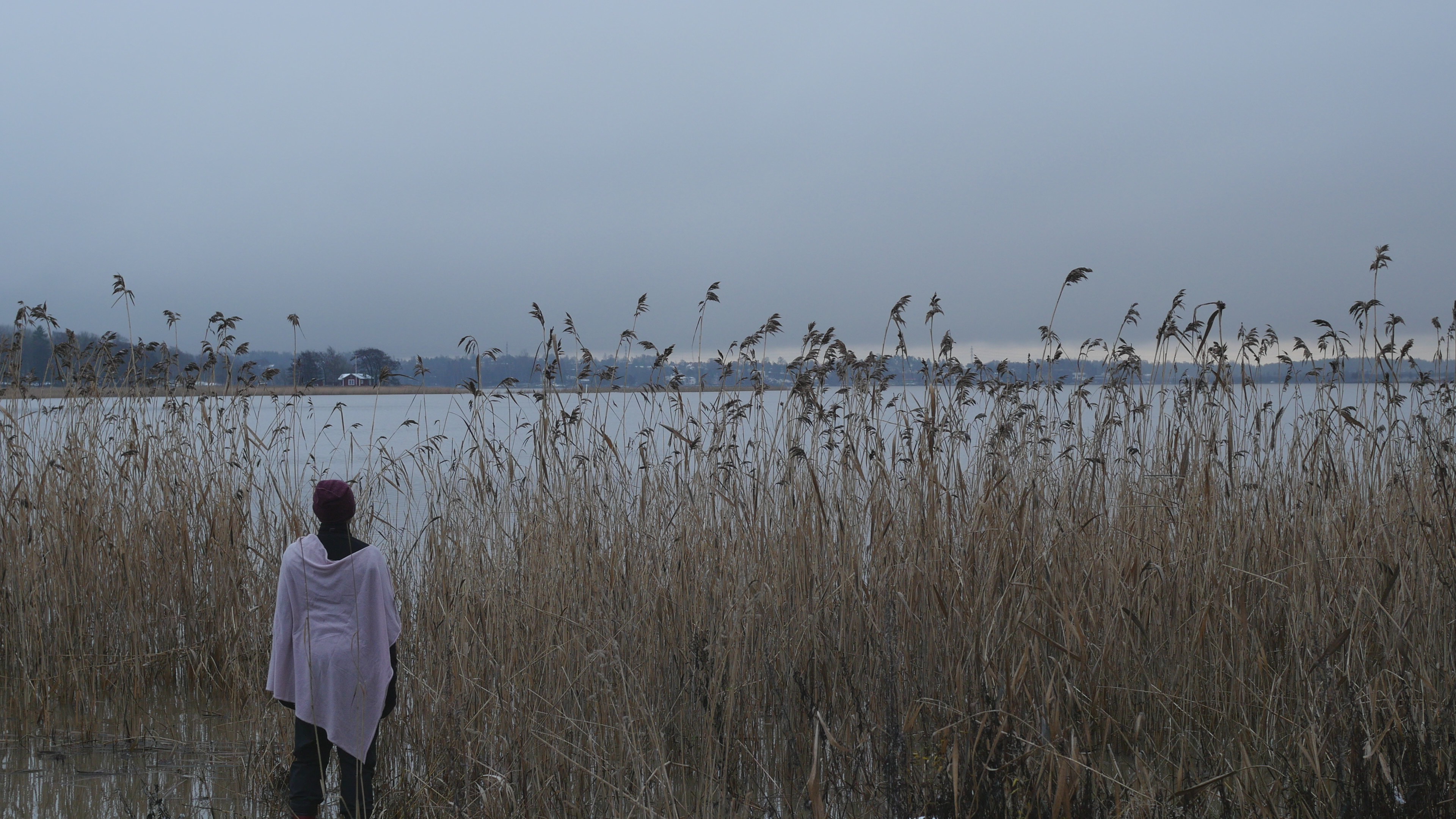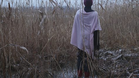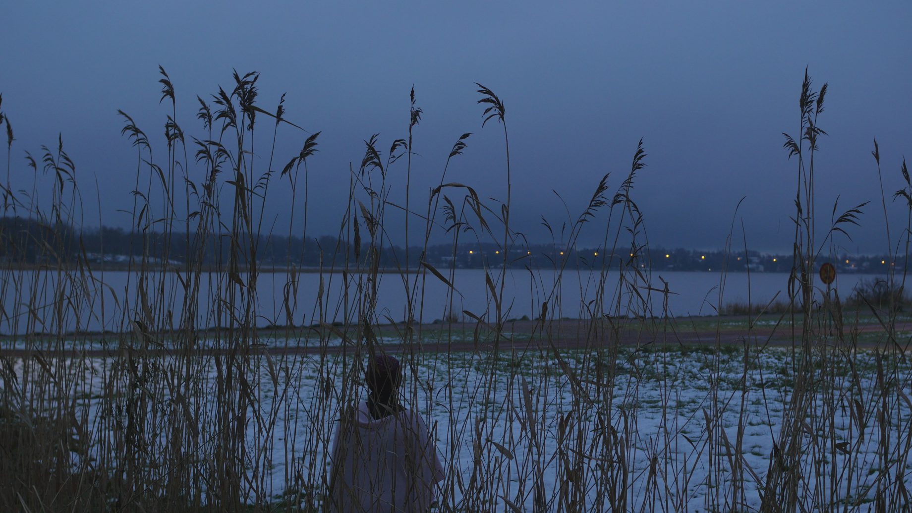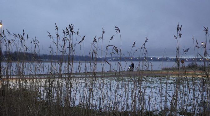 The reeds at the shore looked fine but the high sea level was a problem, however, since it prevented me from walking out among the reeds. I had rubber boots, but they were not high enough. Something resembling those boots that fisher men engageing in sports fishing wear when standing in the rivers would have been good. Now I had to stand close to the shore, in front rather than among the reeds. I made three attempts, or let’s say that I performed for camera for more than a minute as a tryout only in three places. In the third place the reeds were growing in a dike or small trench, which meant that I could stand behind them on the other side and thus among them in some way. Unfortunately the afternoon was quickly turning into evening, so the third image is all blue, with the street lights colouring the snow (see above). In some manner that is a suitable image for November in Helsinki; daylight is grey and dusk comes very early. If reeds really are associated to the dead and the underworld, this way of ending the image in near darkness is perhaps rather appropriate. I edited the material into three videos, Reed in November 1, 2, and 3, all of them 8 minutes and 22 seconds, and uploaded them on the RC, here. They can be seen in context in the exposition performing with plants as well.