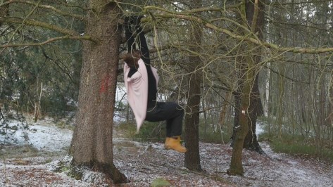 The wood behind DOCH (Dans och Cirkus högskolan, School of Dance and Circus), where I have my working place these days, is part of Norra Djurgården (The Northern Djurgården Park) but unofficially called Lill-Jansskogen.I have been walking around there, along the various paths, looking for a nice tree to sit in, preferably a pine, but have not had much success in finding a suitable one. The wood is fascinating because it is deliberately left rather feral with lots of dead trees, and the terrain is rather varied as well. After making some excursions in the area I finally decided, on the eve of the Chinese New Year, to just make up a round for myself as near as possible to my base, with some stops on the way, something easy to repeat, if not daily, at least weekly. I wanted to begin a series of images to be repeated during the year of the dog – partly because I had missed the chance to begin at the ordinary new year – and to revisit my actions during the year of the dog twelve years earlier. At that time I was sitting in a pine tree on Harakka Island, lying on the rocks as the shadow of a small pine at the shore and also visiting an old pine tree in Kalvola about 100 km north of Helsinki, hanging from its branch and leaning on its trunk, although only once a month. Some of these works are archived on the research catalogue: Year of the Dog – Sitting in a Tree, Day and Night of the Dog, while all of them are available on the pages of AV-arkki, the Distribution Centre for Finnish Media Art, like Year of the Dog – Sitting in a Tree, Day and Night of the Dog, Year of the Dog in Kalvola – Calendar or Year of the Dog in Kalvola – Calendar 1-2, Shadow of a Pine I-II and Shadow of a Pine I-IV.