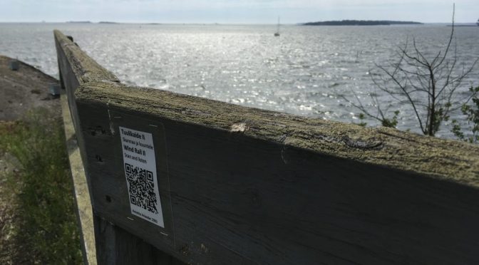 The small exhibition called Näkyvä ja näkymätön meri (Visible and invisible sea) in the former Telegraph and one of the former ammunition cellars celebrates the 30th anniversary of artists (and the Helsinki Centre for Environment) on Harakka Island. It is open until 20 June, only. The outdoor part of my contribution, Windrail II, will remain active for the whole summer. It consist of a simple QR code, on the wall in the Telegraph and on site, attached to the actual rail on the Western shore. The QR code links to a video work recorded by that rail in 2002. I usually prefer to show new works, because I have many that have not been shown anywhere yet. This time I thought this particular video work and especially its voice-over text would be suitable for reminiscing and making the passing of time palpable, too. And it is not available anywhere else.