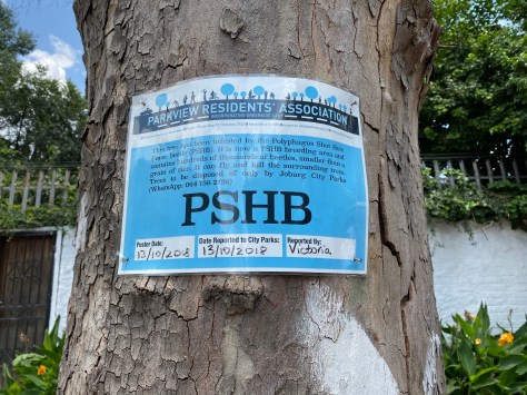 Redan den första dagen i Johannesburg, staden som skryter med att vara världens största planterade skog (de borde se de finska tall- och gran-plantagerna) fick jag höra om den lilla skalbaggen som antastar träden överallt i staden, men i synnerhet i vissa områden, som Parkview där jag placerats att bo. Den lilla insekten “Polyphagous Shot Hole Borer (PSHB)” attackerar många olika träd, det är det som namnet polyphagous avser. Den hör ursprungligen hemma i Sydostasien, särskilt Vietnam, så den har inga fiender här, och träden har heller inte hunnit skapa sig en försvarsstrategi. Det är egentligen svampen som den minimala skalbaggen planterar i trädet och som den livnär sig på som dödar trädet så småningom. Det finns en del bloganteckningar om ämnet, bl.a. här och här, och mer officiellt här.
