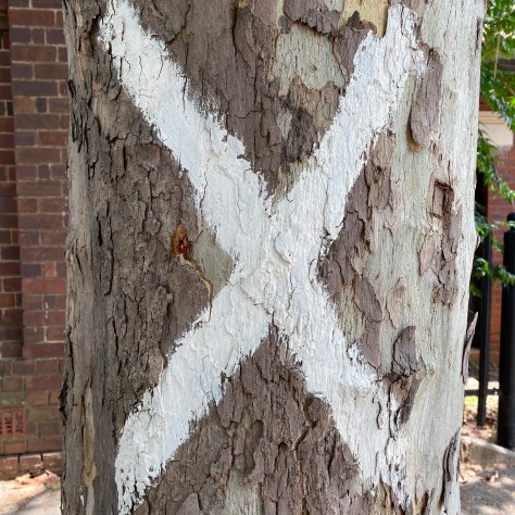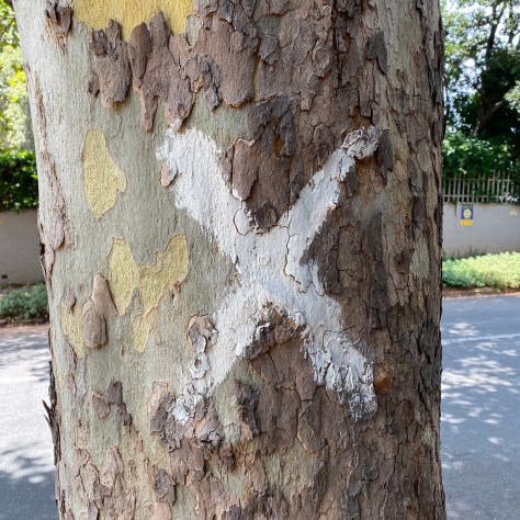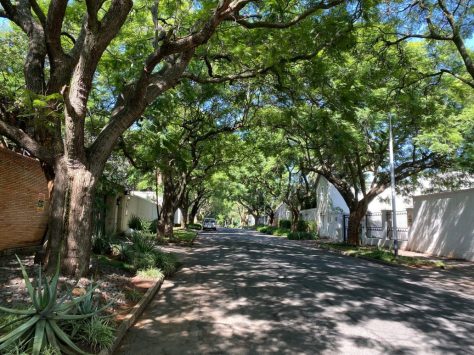 Samuel, min guide och assistent, pekade på de vita kryssen som målats på vissa trädstammar när han visade mig runt i byn. Ja, det är faktiskt som en liten by, en förort med en “high street”, ett slags shoppingcenter, och gator utan belysning, med egnahemshus och villor omgärdade av högra murar och elektriska stängsel. Gatorna har irländska namn, området grundades ursprungligen av en irländare som namngav dem. Jag bor på Galway Road, på en “bed and breakfast” – en stuga intill huset, och breakfast får jag laga själv – som är den enda utan elektriskt nät ovanpå trädgårdsmuren, lyckligtvis. Galway Road kantas av jakaranda träd och inte plataner, som de flesta av gatorna i trakten, och fascinerande nog tycks jakarandan stå bättre emot den här farsoten. Först följande dag då jag begav mig ut för att ta några bilder av de olycksbådande kryssen, såg jag skylten med information på ett av träden: