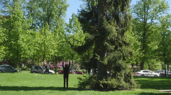 Today I started a new work, a performance with Itsenäisyyden kuusi, the Spruce of Independence, in Kaivopuisto Park. I notised it for the first time a few weeks ago, which in itself is absurd, because I have been walking around in the Park since the 1970’s, but never really payed attention to it, perhaps because it stands in a strange corner of the park, near the entrance to the restaurant. I no longer remember what made me look it up on the internet, but when I saw that it grows in my neighbourhood I decided I would do something with it, as part of the project Meetings with Remarkable and Unremarkable trees. This one surely is remarkable, planted of a seed put in the ground at the time of the declaration of Finnish independence in 1917 and planted on site in the 1930s.