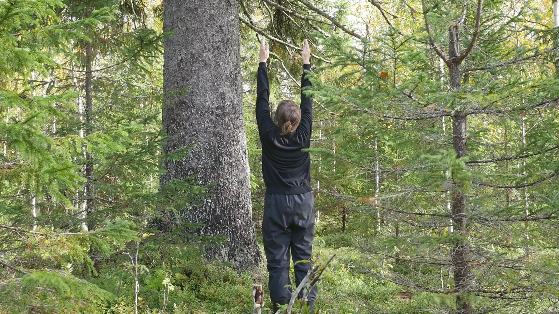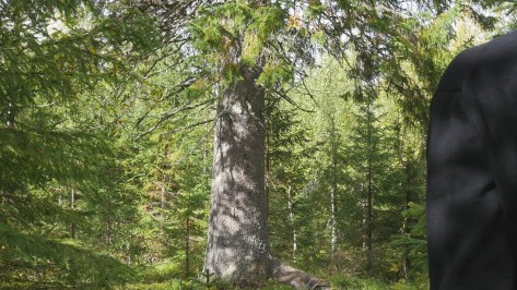 Saapuessani Mustarindaan emäntäni Hanna osoitti jo matkalla korkeaa kuusta joka näkyi ruohottuneen metsätien perällä ja sanoi sen olevan paikkakunnalla huomattava puu. Sittemmin olen kysellyt ihmisiltä ja se tiedetään kyllä, mutta ei siihen ole yhdistetty sen kummempia tarinoita tai kertomusta miksi se on jätetty sinne kasvamaan nuorten kuusten keskelle. Ei sillä myöskään ilmeisesti ole mitään erityistä nimeä, omissa videoissani kutsun sitä nyt nimellä The Spruce in Paljakka. Olen nimittäin ottanut tehtäväkseni vierailla sen luona useaan otteeseen ja kokeilla eri lähestymistapoja ja aiemmin käyttämiäni keinoja esiintyä kameralle sen kanssa. Niinpä olen kiertänyt sen ympäri, kuvannut sitä juuresta latvaan, istunut sen juurella, katsellut sitä läheltä ja kauempaa, kurottanut kohti sen oksia, ja jopa yrittänyt maata maassa sen alla jalat runkoa vasten. Mutta ne yritykset kamerani sensuroi, kieltäytymällä toimimasta. Olen koonnut joitakin kuvia ja videoita jokaisesta vierailustani RC alustan sivulle, tänne. Jonakin päivänä ehkä kirjoitan artikkelin, jossa valitan vaikeutta esiintyä yhdessä tuollaisen jättiläisen kanssa ja käyn läpi kaikki yritykseni. Mutta nyt jatkan vielä kokeitani, pari viikkoa minulla on aikaa tuskailla kuusen kanssa ja nauttia viilenevästä syksystä täällä korvessa, ikimetsien keskellä.