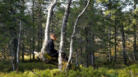 Efter en produktiv september månad i Mustarinda residenset tänkte jag mig, att det var nog, ifall jag fortsatte min lilla performance, min “dagliga björk” med den gamla björken bakom Mustarinda huset. Men den sista dagen beslöt jag mig ändå för att försöka sätta mig och skriva ett brev till en gran som jag lagt märke till tidigare, där den låg på marken vid stigen. Jag tänkte mig att det kunde vara intressant att försöka skriva något på svenska, för jag hade skrivit på finska till en annan gran veckan innan. Men alldeles intill granen såg jag plötsligt en björk som såg inbjudande ut. De flesta träden i den urgamla skogen är antingen raka och höga eller så ligger de på marken, jag har inte sett något träd med grenar att kliva upp på. Och där var nu plötsligt en björk som jag skulle kunna sitta på, jag kunde inte begripa att jag inte märkt den tidigare. Så jag valde att sätta mig hos den och skriva till björken istället, och lät granen vänta. Jag spelade in texten senare och kombinerade den med bilden, men då själva skrivandet tog mer än 20 minuter, blev den upplästa texten bara drygt fem minuter, så versionen med texten blev mycket kortare. Båda versionerna – Dear Birch (20 min 15 sec) och Kära Björk (5 min 50 sek) – finns på Research Catalogue, här. Och här nedan är texten jag skrev framför kameran.