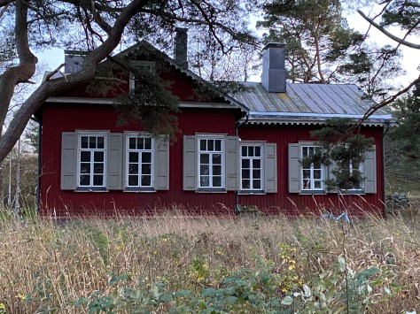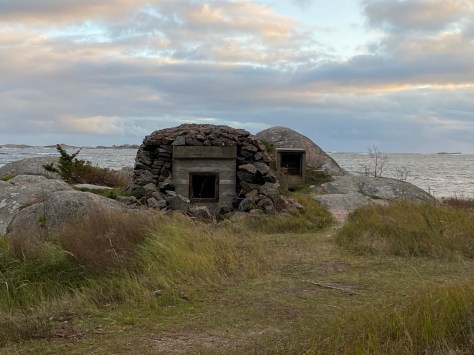 Efter bara fem dagar på ön är jag helt förtjust, och idag fick tillvaron en helt ny lyster, när plastskydden på fönstren togs bort och de nya fönsterrutorna kom på plats. Jag skall tillbringa hela november månad här i Öres residenset, med ett kort besök i Helsingfors en weekend, och det känns oerhört skönt. Det blåser hårt för det mesta och regnar ibland men i övrigt känns det inte som november. Och ön är inte alls så öde som jag befarade. Dels bor min granne, en ung spansk konstnär på andra sidan huset, dels rör sig en del folk omkring på cyklar, och till och med krogen öppnar på lördagen, för det är en grupp som kommer hit över weekenden. Men det härliga är vindens brus i tallarna och havet som slår mot stranden. Visst är de olika militära ruinerna och kvarlevorna kusliga, men nu känns naturskyddsåtgärderna mer påtagliga. De märkta stigarna är sköna att vandra längs och det finns gott om informationsskyltar överallt. Jag antar att det kan vara ganska fullspäckat med folk när det är turistsäsong. Just nu kunde jag tänka mig att vara här mycket längre.