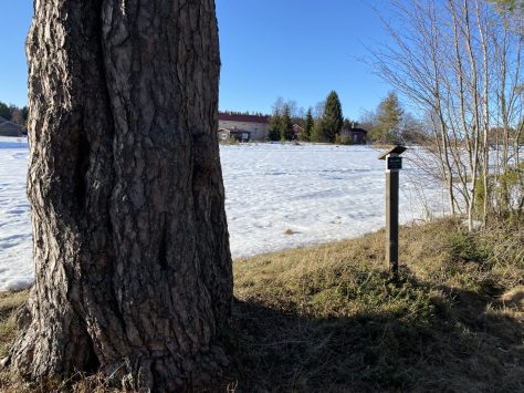 At the end of my first week in Hailuoto, in a residency called daycare center, the sun finally decided to shine as beautifully as on the day when I arrived here last week. Most of the time there has been snowfall or rain, with more and more snow preventing the old snow from melting and the winter lingering on. Now the brilliant sunshine sparkled in the frost on the puddles on the muddy roads, at least hinting at a promise of spring. And today I finally visited my first Tarri pine, a special type of local pine with a thick trunk and a spread out crown. One of the most famous ones, the Askelin pine, probably named after the farm it is growing on, is known for enduring several wars, and they say it was damaged during the war 1742-43 and has also been hit by artillery. It is actually protected now, with reference to the nature protection law (luonnonsuojelulain nojalla), a sign next to it declares: