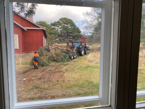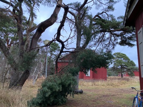 Vuosi sitten vietin koko marraskuun Örössä, Öres residenssissä, ja se oli “rakkautta ensi silmäyksellä”. Kun peruutuksen takia tarjoutui tilaisuus tulla viikoksi tänne taas, innostuin heti, ja nyt kun on aika lähteä takaisin en todellakaan kadu. Olen viihtynyt Örössä myös vierasmajassa muutaman kerran mutta residenssi eteläkärjessä on toista. Ja tällä kertaa koko talo oli tyhjä, minä siis ainoana asukkaana. Viikkoon tai oikeastaan kymmeneen päivään – tulin Stellan kyydissä torstaina 11.11. ja lähden nyt Wilsonin kyydissä 21.11. – mahtui sekä sadetta ja sumua että kirkasta auringonpaistetta kuten tänään. Ja välillä tuulista, tietysti, kuten aamukävelyllä ottamani kuvan aallokosta näkyy. Eilen oli poikkeuksellisen tuulinen päivä, mutta talon edustalla kasvavaa vanhaa mäntyä kohdannut myrskyvaurio sattui jo ennen sitä. Ei ollut edes kovin tuulista kun heräsin yöllä räsähdykseen, ja mietin mikä putosi. En nähnyt mitään ja jatkoin uniani, mutta aamulla selvisi, että iso oksa oli lohjennut ja roikkui nyt puun ja seinän välissä. Se oli ilmeisesti pudonnut osin katon kautta, ja irrottanut jotain tiiliä. Kun näin Metsähallituksen traktorin tiellä vihjasin kuljettajalle että oksa oli katkennut, lähinnä näytin sen suuntaan ja hän tuli pian toisenlaisen koneen kanssa katkaisemaan ja pilkkomaan sen. Ja myöhemmin tuli vielä toinen porukka korjaamaan kattotiiliä. Tehokasta toimintaa, täytyy sanoa, eikä siinä monta sanaa vaihdettu. Hyvä että ehdin edes ottaa kuvan roikkuvasta oksasta. Mänty parka on nyt vailla yhtä isoa oksaansa, ja sen kyljessä ammottaa haava, kun oksa on repinyt kaarnan repeytyessään irti, mutta muuten puu näyttää voivan hyvin. – Lähden täältä hyvillä mielin, sillä olen saanut kuvattua sen mitä pitikin, mm. viimeiset vierailuni vuoden mittaan toistuvasti pamaani mäntyjen luona (katso täältä), ja muutakin. En tietenkään kirjoittanut kaikkea mitä kuvittelin kirjoittavani, mutta niin minulle yleensä käy. Yliarvioin melkein aina taitoni, aikani ja voimani. Mutta tärkeintä oli päästä nauttimaan tästä Örön syksystä edes vähäksi aikaa, siitä saa energiaa jaksaa pimeiden viikkojen yli. Kiitos kaikille jotka olivat tietäen tai tietämättään mahdollistamassa sen.