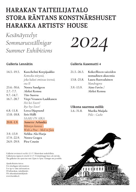Vuonna 2023 keskustelin toistuvasti Kaivopuistossa kasvavan männyn kanssa englanniksi ajankohtaisista ajatuksistani, osana hanketta Miettii mäntyjen kanssa. Keskusteluista koottu sarja videoteoksia Pondering with a Pine in the Park 1–22 on esillä Harakan Lennätingalleriassa 20.8.-1.9.2024, ti-sun klo 12-17. Lisätietoja https://ponderingwithpines.com