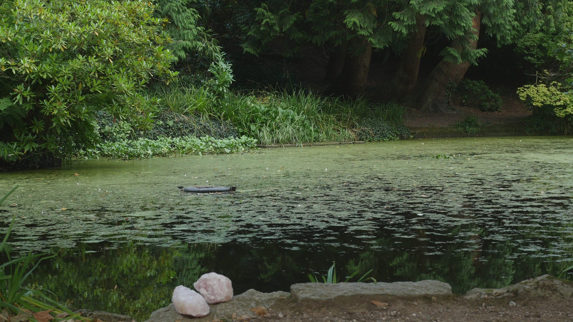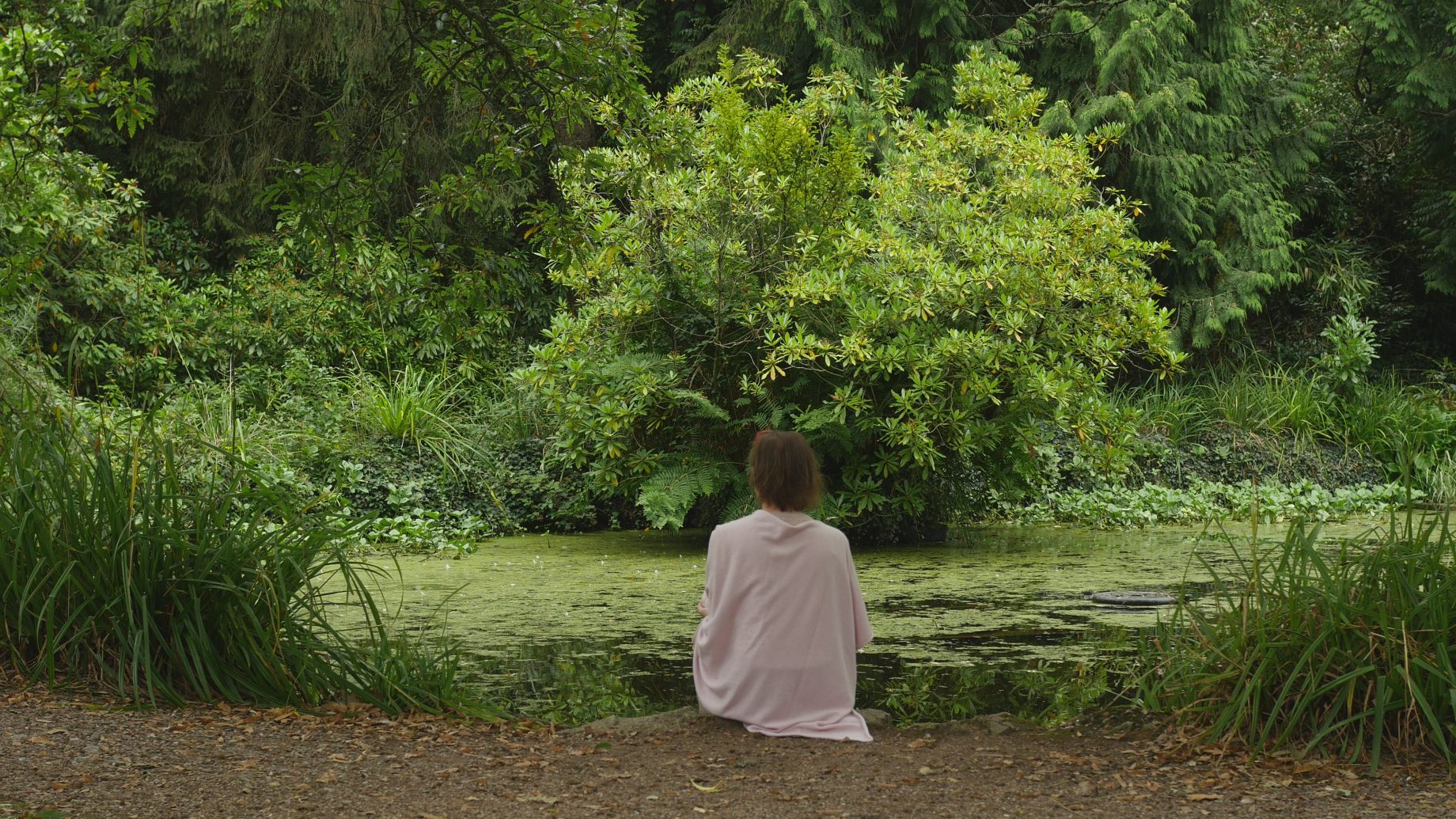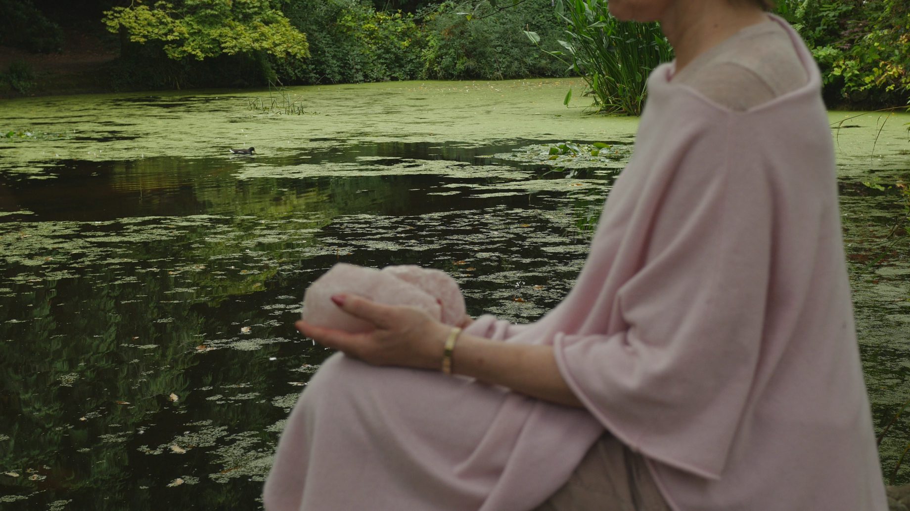 The morning was overcast and there was not much light in the shade of the oak. While moving about trying to adjust the image I was somehow careless, so one of the rocks fell into the pond. I was shocked, feeling like Adalmina, the little princess in a fairy tale by the Finnish writer Zachris Topelius, who lost her pearl and thereby all her good fortune in a pond due to her vanity. Luckily the pond was not very deep, I could see the rock and tried to reach it but quickly noticed there was no other way than to undress and climb down into the pond. I did that and retrieved the rock, hoping that nobody had passed by exactly then. The rock felt nice and fresh after having its bath, so I washed the other one, too. When I finally sat down I saw a huge fish swim by, probably curious or expecting to be fed. I decided to use my phone as a timer, since I wanted to have enough material but also to be in time for the seminar, and thought 15 minutes would be enough so I put the timer on 17 minutes, started the camera – or so I thought – and sat down. I counted my breathing, partly to calm down, partly to focus, since sitting was surprisingly uncomfortable and the rocks in my hands felt heavy. Some birds were making loud sudden sounds that startled me and would probably show in the image. Slowly it started to rain, softly. The droplets created beautiful patterns on the surface of the pond, and I was happy with this link to the rain in Falmouth. The rain came and went several times, almost starting and then receding again and never really turning into a proper rain. Finally the sun came out and made the rocks sparkle in my hands. I wondered about the time, but decided to continue until 250 breaths and leave it at that; my left leg felt numb and enough was enough. I got up and realized the camera was black, when did it turn off and why? I looked again, and once more, and finally realized, I had never turned it on! And the same might be true of the timer, or then I just did not hear the sound. I felt devastated, all this beauty and pain had been in vain, experienced by me alone. By now it was five minutes to ten, I had been sitting there for more than half an hour, so I had to hurry to the seminar. – Later Paula told me she had seen me sitting, when she came to practice, and the sun arriving, too, but did not want to disturb me. It was a consolation to know there had been a witness, but I still wanted to make the image…