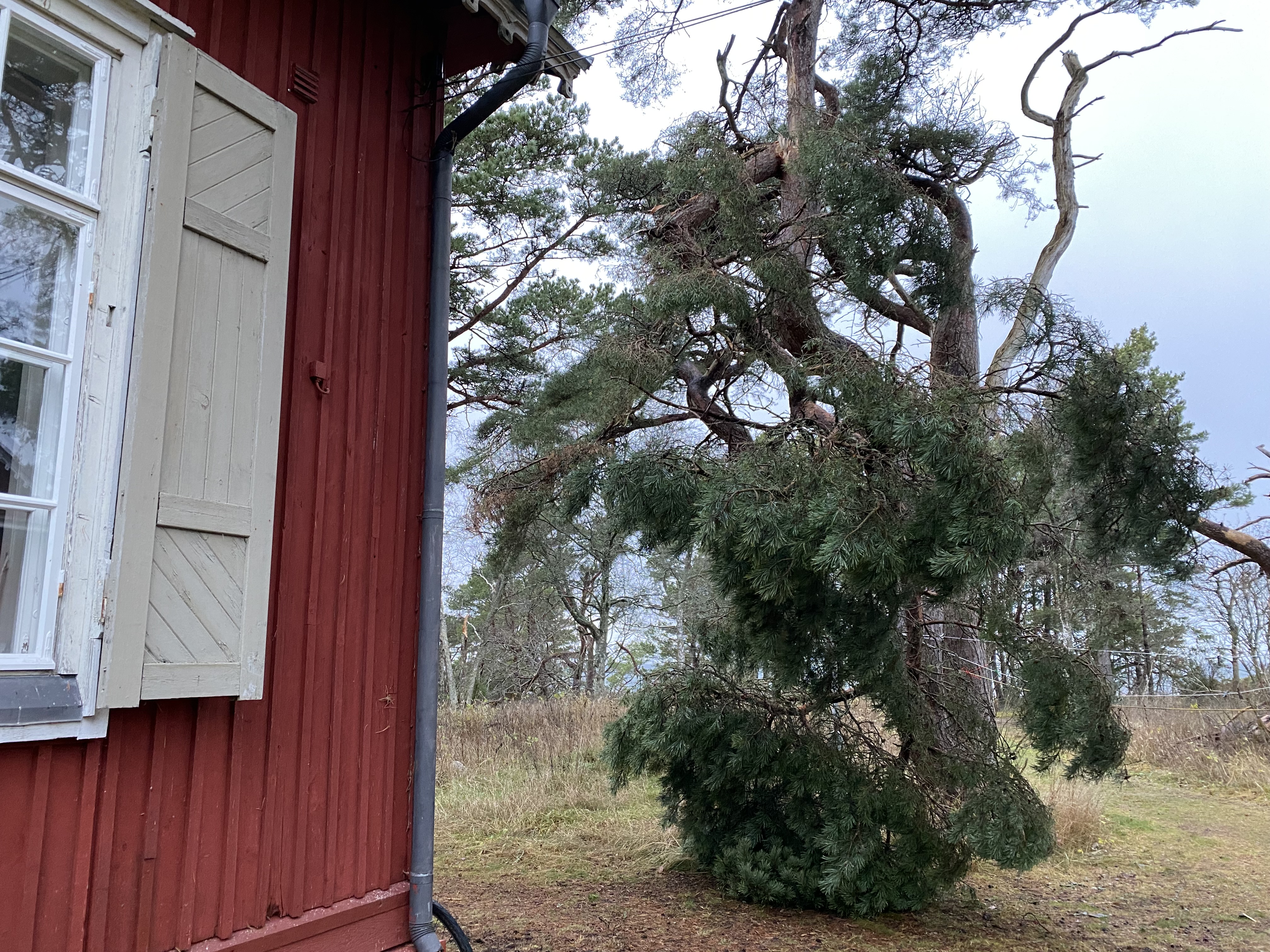 Vuosi sitten vietin koko marraskuun Örössä, Öres residenssissä, ja se oli “rakkautta ensi silmäyksellä”. Kun peruutuksen takia tarjoutui tilaisuus tulla viikoksi tänne taas, innostuin heti, ja nyt kun on aika lähteä takaisin en todellakaan kadu. Olen viihtynyt Örössä myös vierasmajassa muutaman kerran mutta residenssi eteläkärjessä on toista. Ja tällä kertaa koko talo oli tyhjä, minä siis ainoana asukkaana. Viikkoon tai oikeastaan kymmeneen päivään – tulin Stellan kyydissä torstaina 11.11. ja lähden nyt Wilsonin kyydissä 21.11. – mahtui sekä sadetta ja sumua että kirkasta auringonpaistetta kuten tänään. Ja välillä tuulista, tietysti, kuten aamukävelyllä ottamani kuvan aallokosta näkyy. Eilen oli poikkeuksellisen tuulinen päivä, mutta talon edustalla kasvavaa vanhaa mäntyä kohdannut myrskyvaurio sattui jo ennen sitä. Ei ollut edes kovin tuulista kun heräsin yöllä räsähdykseen, ja mietin mikä putosi. En nähnyt mitään ja jatkoin uniani, mutta aamulla selvisi, että iso oksa oli lohjennut ja roikkui nyt puun ja seinän välissä. Se oli ilmeisesti pudonnut osin katon kautta, ja irrottanut jotain tiiliä. Kun näin Metsähallituksen traktorin tiellä vihjasin kuljettajalle että oksa oli katkennut, lähinnä näytin sen suuntaan ja hän tuli pian toisenlaisen koneen kanssa katkaisemaan ja pilkkomaan sen. Ja myöhemmin tuli vielä toinen porukka korjaamaan kattotiiliä. Tehokasta toimintaa, täytyy sanoa, eikä siinä monta sanaa vaihdettu. Hyvä että ehdin edes ottaa kuvan roikkuvasta oksasta. Mänty parka on nyt vailla yhtä isoa oksaansa, ja sen kyljessä ammottaa haava, kun oksa on repinyt kaarnan repeytyessään irti, mutta muuten puu näyttää voivan hyvin. – Lähden täältä hyvillä mielin, sillä olen saanut kuvattua sen mitä pitikin, mm. viimeiset vierailuni vuoden mittaan toistuvasti pamaani mäntyjen luona (katso täältä), ja muutakin. En tietenkään kirjoittanut kaikkea mitä kuvittelin kirjoittavani, mutta niin minulle yleensä käy. Yliarvioin melkein aina taitoni, aikani ja voimani. Mutta tärkeintä oli päästä nauttimaan tästä Örön syksystä edes vähäksi aikaa, siitä saa energiaa jaksaa pimeiden viikkojen yli. Kiitos kaikille jotka olivat tietäen tai tietämättään mahdollistamassa sen.