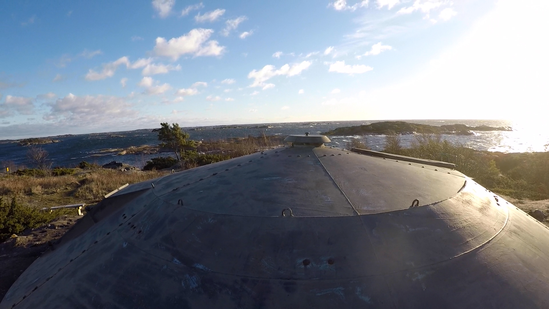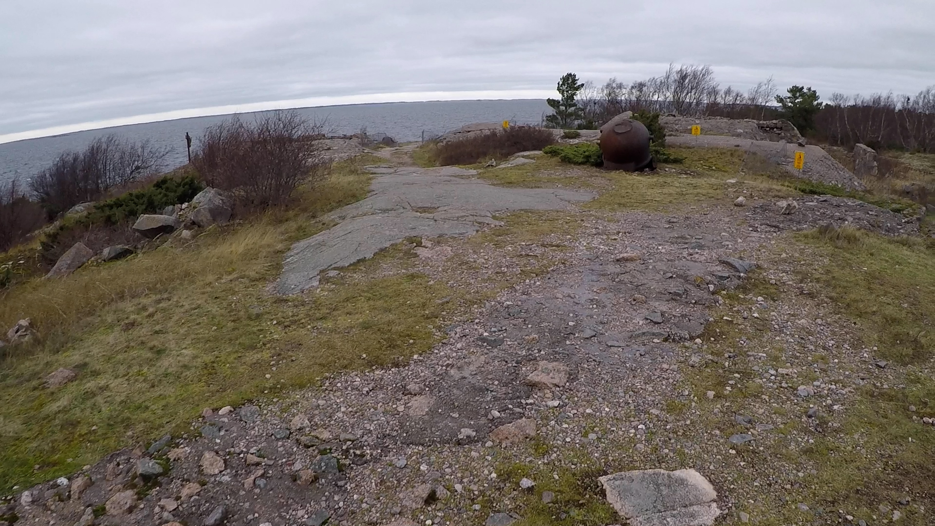 Having the opportunity to spend a week, or actually ten days on Örö, I wanted to explore some new ideas, besides continuing my usual routines. These include visiting The Pine Next Door daily while I am on the island, and talking to or with the pine on the western shore at least once during each trip. This time I recorded the seventh and last Tell it to the Pine (Tala om det för tallen), in Swedish, as usual. The new thing I wanted to explore, which does not really fit into my current project Meetings with Remarkable and Unremarkable Trees, is not really new, but a further development of something I explored in Nida in September 2017, namely walking (see Walking in Nida). And doing that with an action camera on my forehead. The long road through the island on Örö, from south to north or north to south, covered in cobble stones and built in Russian times is called Pitkä ikävä, a Finnish name that translates as the long boredom and also the long yearning. The road is long and almost straight and uncomfortable to walk on at times, but also inviting to record on video, because it traverses the whole island. Therefore I have now recorded five walks from south to north and back, in order to combine them somehow, perhaps not in a grid as I did in Nida, but as a diptych with images inserted into each other. How that will work I do not know yet, but at least I have enough material. And because the half an hour walk is hard to time to be of equal length both ways, I quickly discovered I should begin and end each walk by standing still for a while. Here are the first and last images from my first walk from north to south.