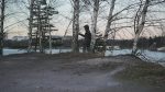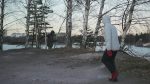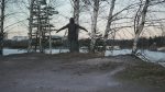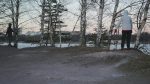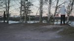 Vuoden ensimmäinen vierailu ”pöheikössä” Kirsi Heimosen kanssa toteutui kylmän tuulisena ja aurinkoisena talvipäivänä, ensimmäisenä sellaisena monien sateisten päivien jälkeen. Paikkana oli Sigurd Frosteruksen puisto Hietaniemen uimarannan vieressä, oikeastaan pieni niemenkärki, johon oli nostettu veneitä talviteloille, ja jota kiersi kuntopolku. Kirsi oli valinnut paikan, Hietaniemi on minulle outoa seutua vaikka joskus nuorena asuin vähän aikaa Museokadun länsipäässä. Siitä ei ollut apua kun yritin löytää paikkaa, jota google maps ei tuntenut. Bussi 24 olisi tuonut minut suoraan perille, mutten malttanut odottaa sitä, koska pelkäsin myöhästyväni, otin kolmosen ja yritin vaihtaa 18 tai 14 bussiin, mutta kumpikaan ei osunut kohdalle oikeaan aikaan. Niinpä päädyin kävelemään koko matkan, ja myöhästymään paljon pahemmin, yli puoli tuntia! Kun lopulta pääsin rantaan aurinko oli jo laskemassa ja Kirsi aivan kohmeessa. Löysinme kuitenkin paikan suojan puolelta ja liikuskelimme hetken nuorten koivujen kanssa jyrkässä rinteessä, joka ei tosin näytä jyrkältä kameran suunnalta. Lähdinme etsimään vielä toistakin paikkaa, ja ihastelimme autiota uimarantaa, mutta hämärä alkoi jo laskeutua ja päätimme palata samoille seuduille myöhemmin uudestaan.