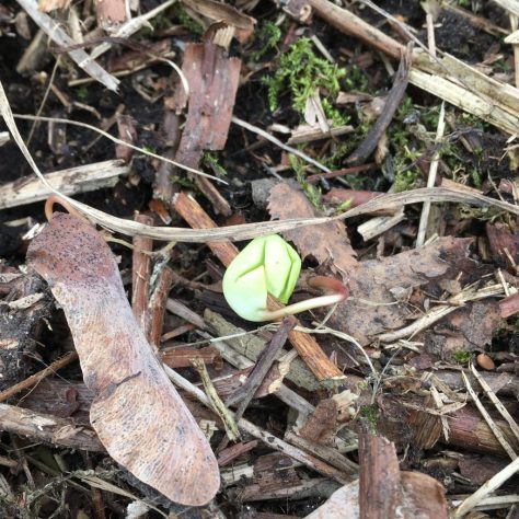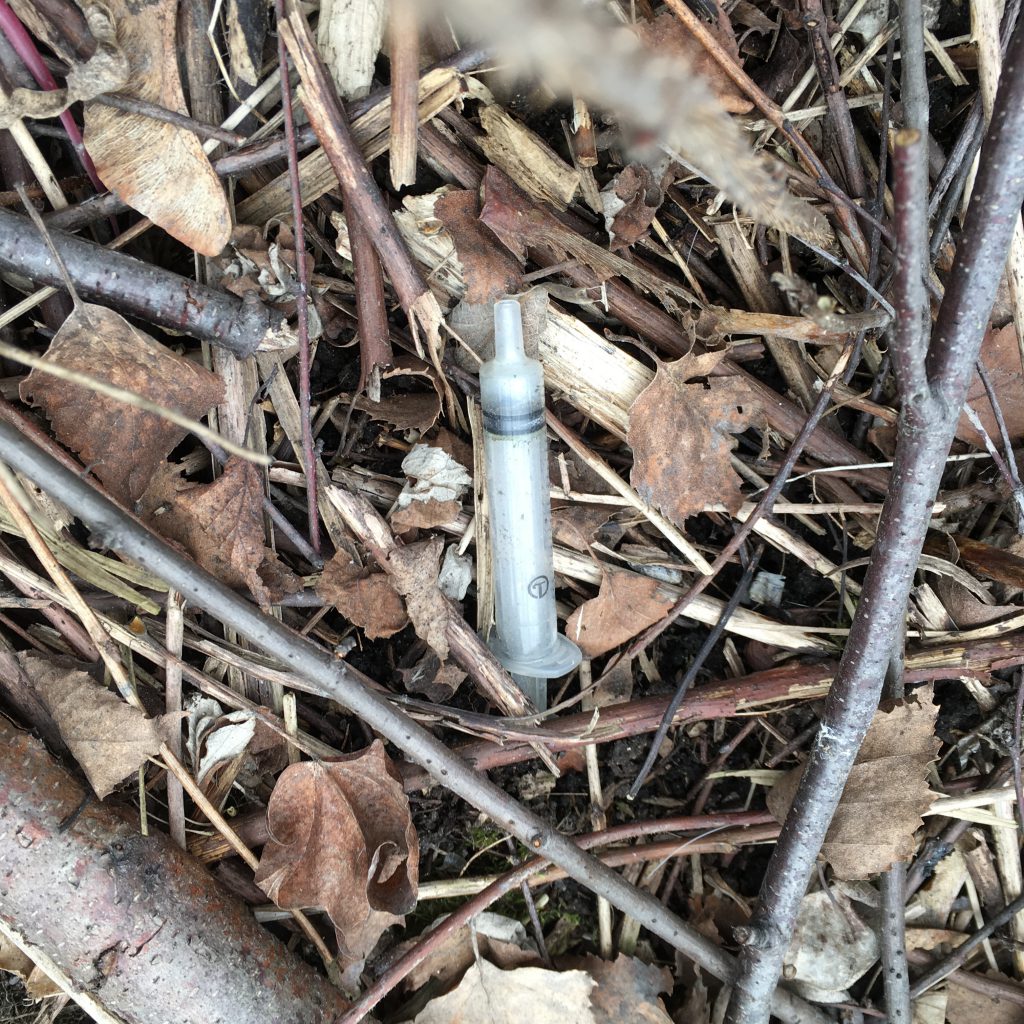 Kontatessani maassa silmiini osui pieniä ituja, niin pieniä kerällä olevia silmuja, ettei niistä mitenkään voinut nähdä mitä oli tulossa, alkavaa elämää hauraimmillaan. Tai miksei vahvimmillaan? Vaikka pieni lehtikiehkura näyttää avuttomalta, sillä on valtavat voimat puskea vanhojen kuivien lehtien lomasta, jopa niiden lävitse valoon. Ja sitten, aivan vieressä, tyhjä ruisku, uh! Muutkin olivat löytäneet tämän keskeisellä paikalla sijaitsevan ryteikön. Onneksi olin pukeutunut “kurahaalareihin” ja tottunut kaikenlaisiin jätteisiin erilaissa pöheiköissä vieraillessamme. Vasta kun olimme aikamme liikkuneet ja leikkineet ja jo lähdössä pois Kirsi huomasi toisen, korkealle nuoren koivun runkoon isketyn ruiskun. Se oli jotenkin karmea, raivon ele. Onneksi näimme sen vasta lähtiessä, muuten tuskin olisimme viihtyneet tuossa paikassa tai valinneet sitä leikkipaikaksemme.