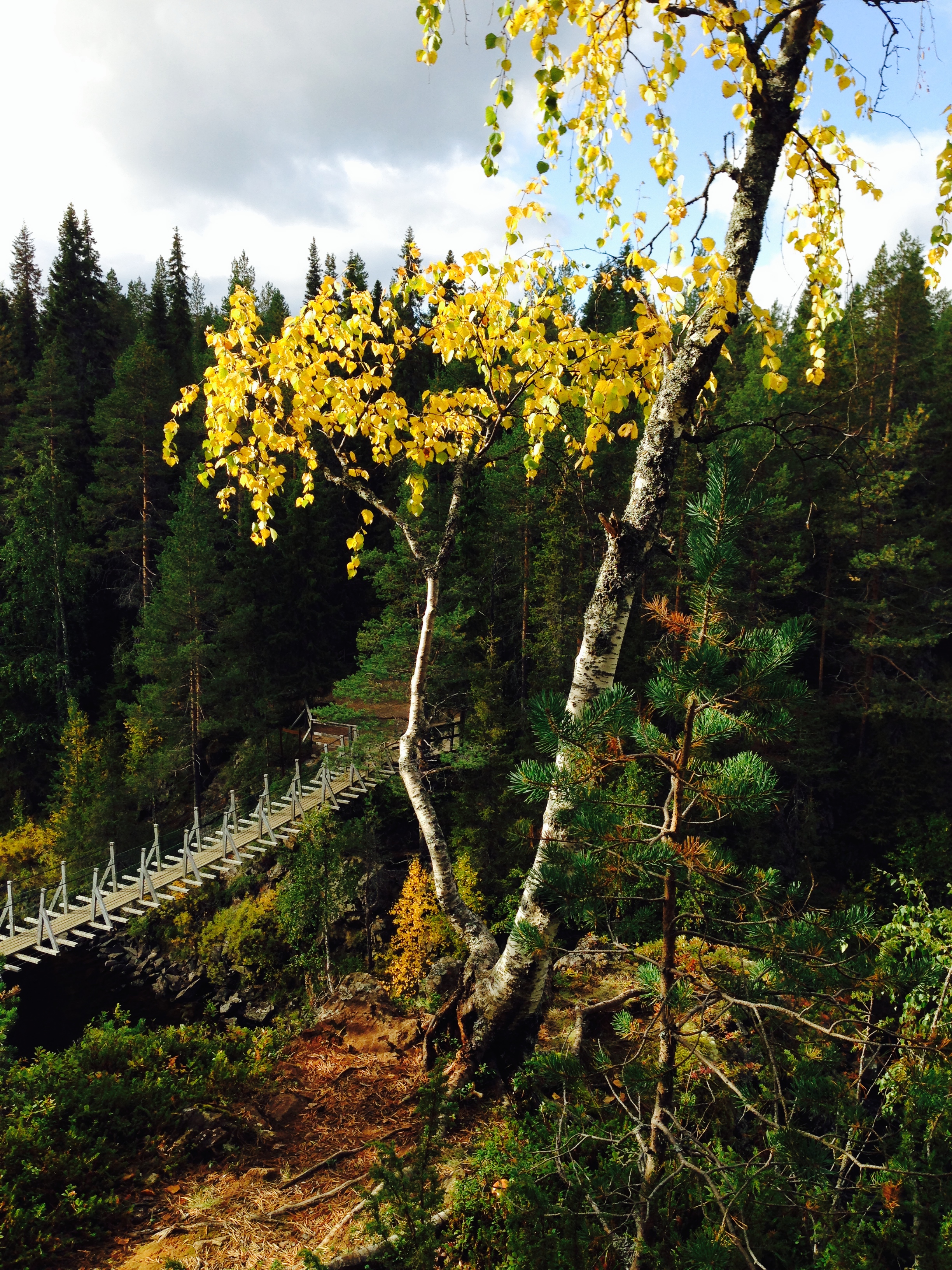 The hiking path called the Little Bear’s Trail is a 12 km circular walk that touches the real 80 km Bear Trail in Oulanka National park. In Finnish it is called pieni karhunkierrosThe huge park is situated quite near the Russian border in Koillismaa (northeastern land) in the northeast of Finland. It is supposed to be one of the most beautiful national parks in the country, and yes, after seeing a small corner of it I have to admit that it is quite spectacular, especially now when the colours of autumn start to spread on the slopes. It has some beautiful gorges and river valleys with rapids that attract people engaged in white water sports. The small suspension bridges swinging with each step are quite scary for a person unaccustomed to them.