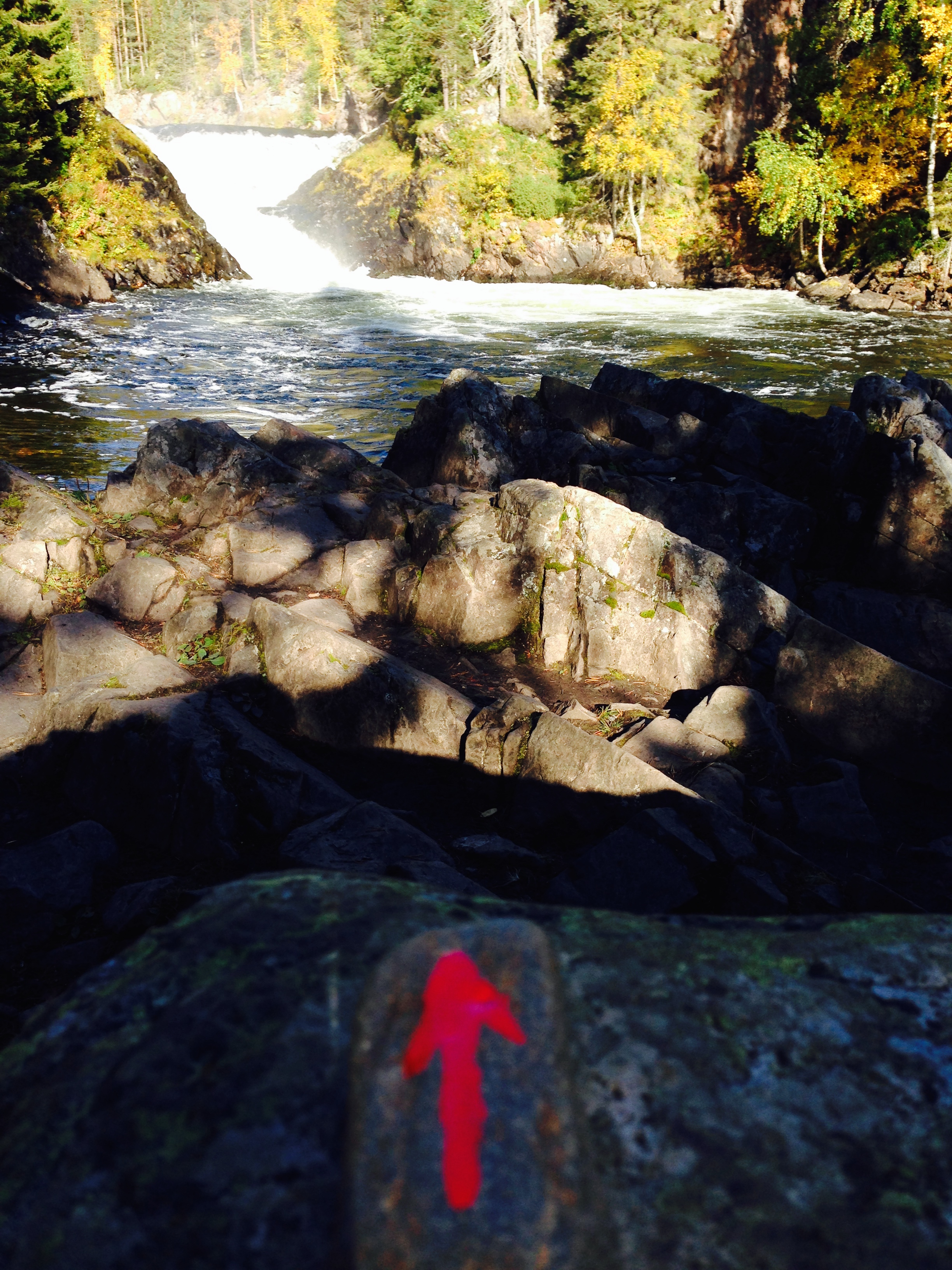 One of the main attractions in the Helvetinjörvi National Park in central Finland is the narrow gorge called Helvetinkolu (Hell’s cleft) that leads down to the lake. More about the park and the famous cleft here. Hiking in the area with a friend during the weekend and enjoying the various forest types and many small lakes next to each other was not meant as a working trip, although I did bring my camera. And the small stone with the red arrow, of course.
